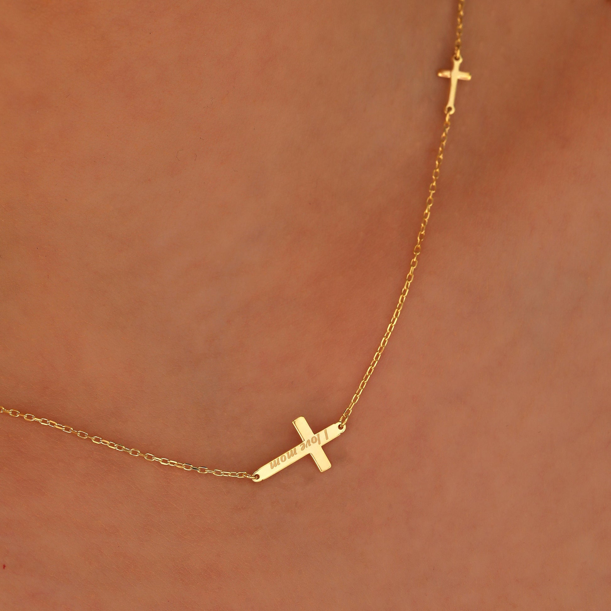 Now even more special! This elegant necklace featuring both large and small crosses can be personalized with your loved one's name, a special date, or a meaningful word. Crafted in sterling silver (.925) and gold-plated options for a timeless, stylish piece that lasts forever.