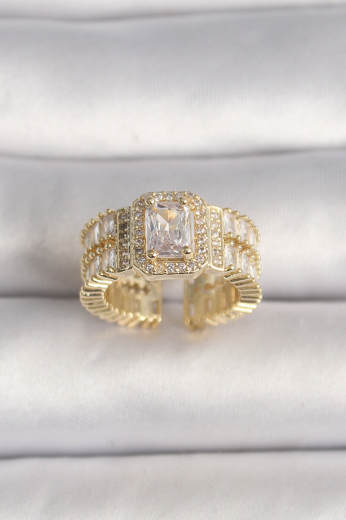 Brass Gold Color Adjustable Baguette Zircon Stone Model Women's Ring