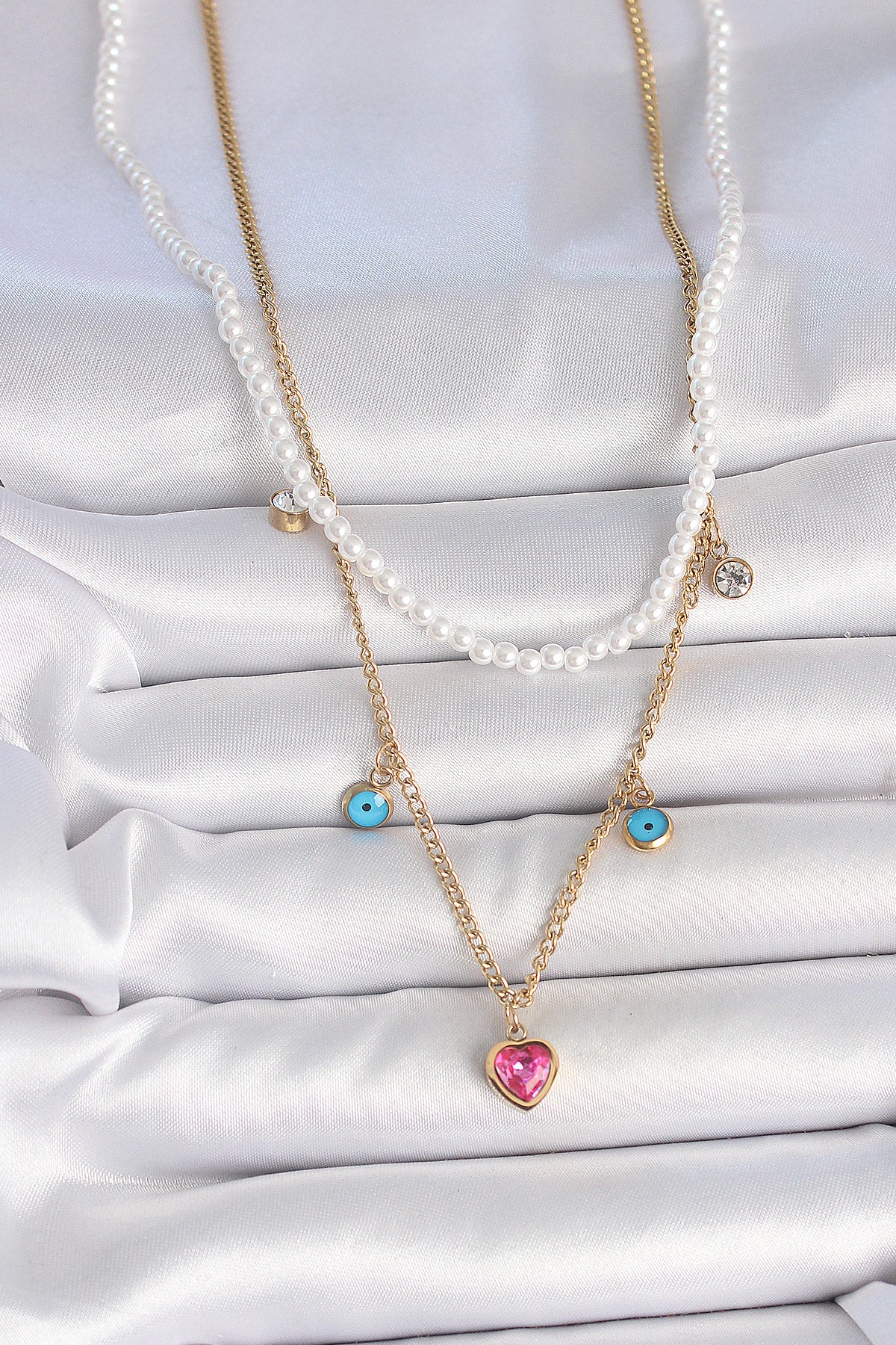 316L Çelik Gold Renk 2'Li İnci Zincir Model Pembe Taşlı Kalp Figür Nazar Boncuk Detay Kadın Kolye