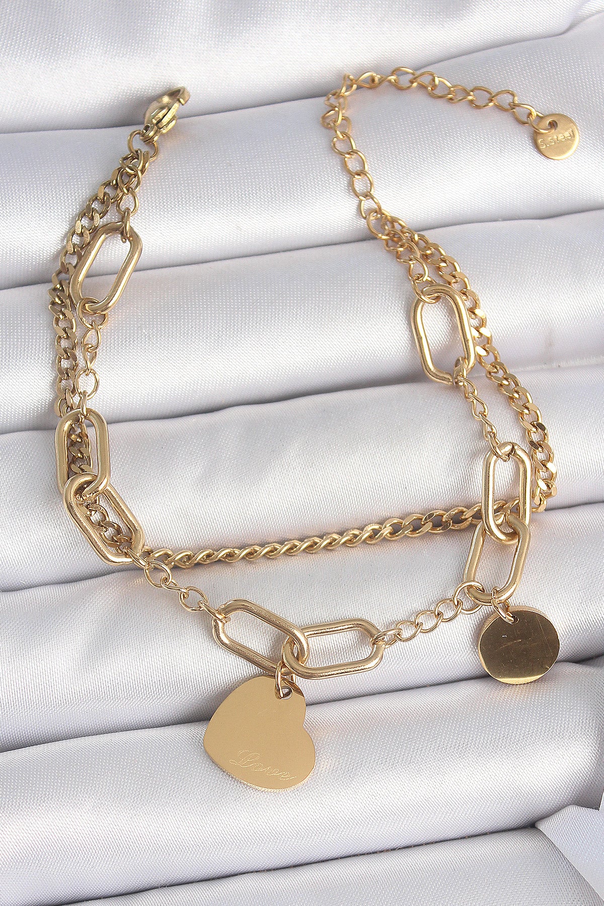 316L Çelik Gold Renk 2'Li Zincir Model Sallantı Kalp Figür Kadın Bileklik