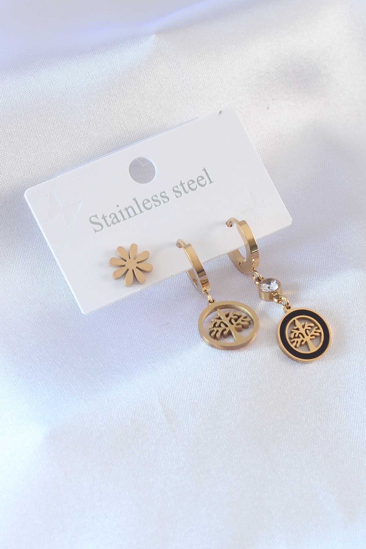 316L Çelik Gold renk Ağaç Model Çiçek Detay Zirkon Taşlı Kadın Küpe