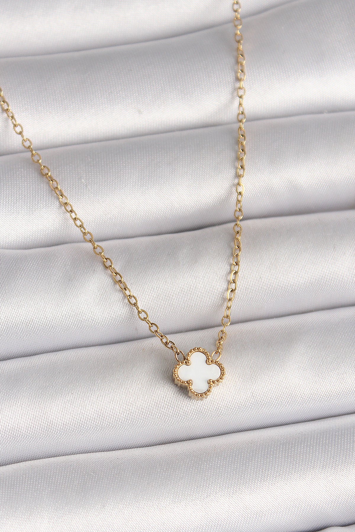 316L Çelik Gold Renk Beyaz Yonca Model Kadın Kolye
