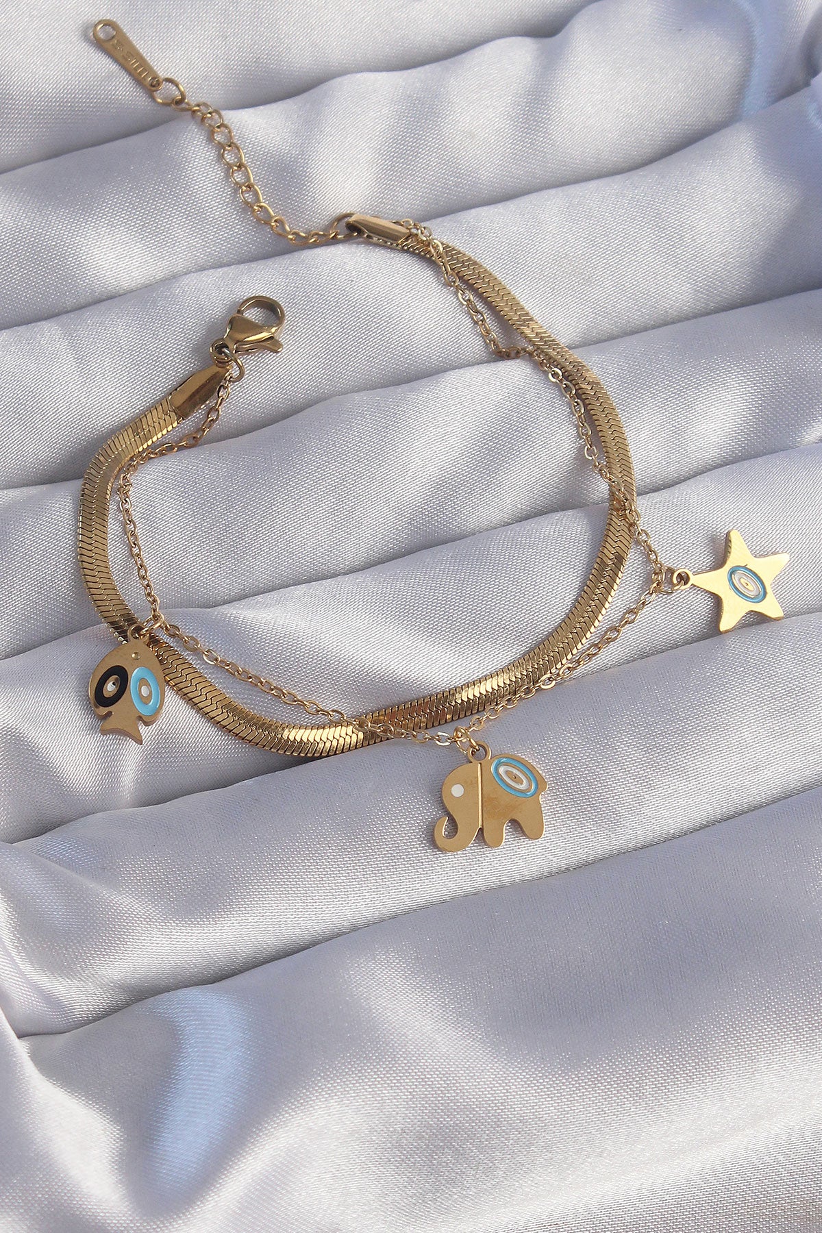 316L Çelik Gold Renk Çift Zincir Çoklu Aksesuarlı Bileklik