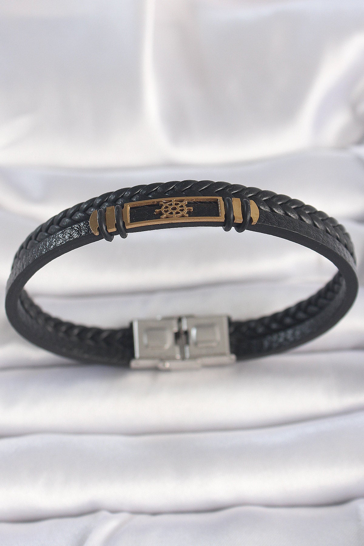 316L Çelik Gold Renk Gemi Dümeni Aksesuarlı Çift Sıra Burgu Desenli Deri Kordon Erkek Bileklik