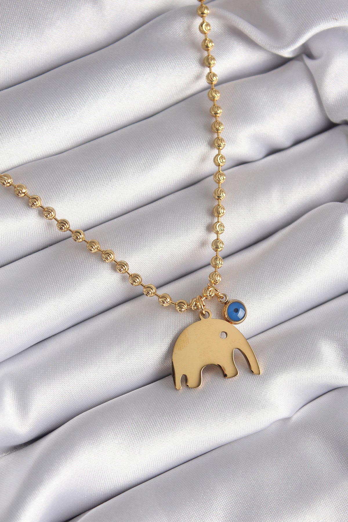 316L Çelik Gold Renk Top Zincir Model Fil Figür Nazar Boncuk Detay Kadın Kolye