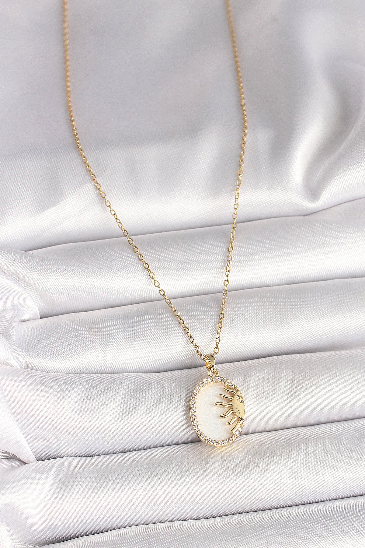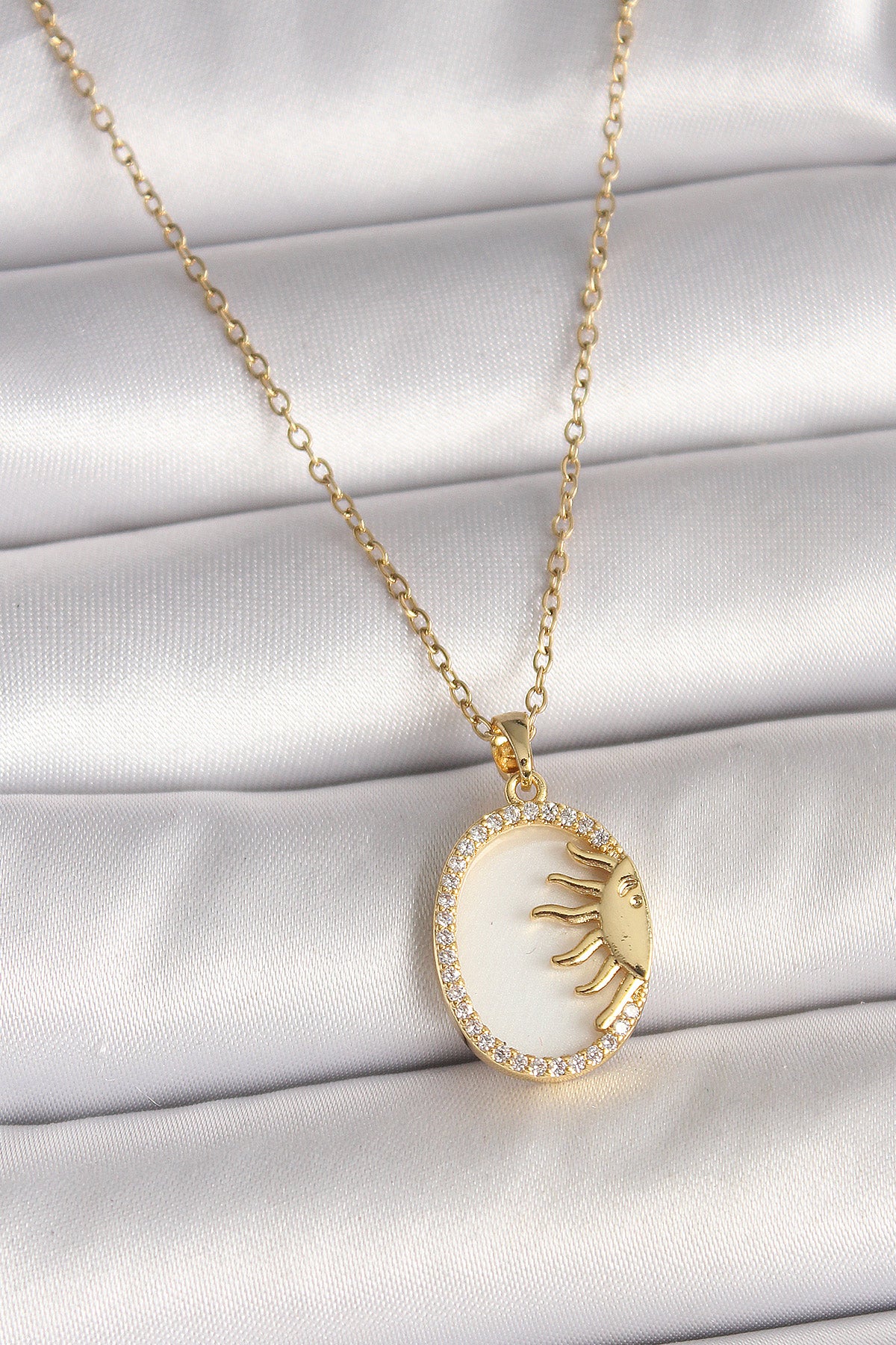 316L Çelik Gold Renk Zincir Beyaz Mineli Gün Batımı Model Zirkon Taş Detay Kadın Kolye