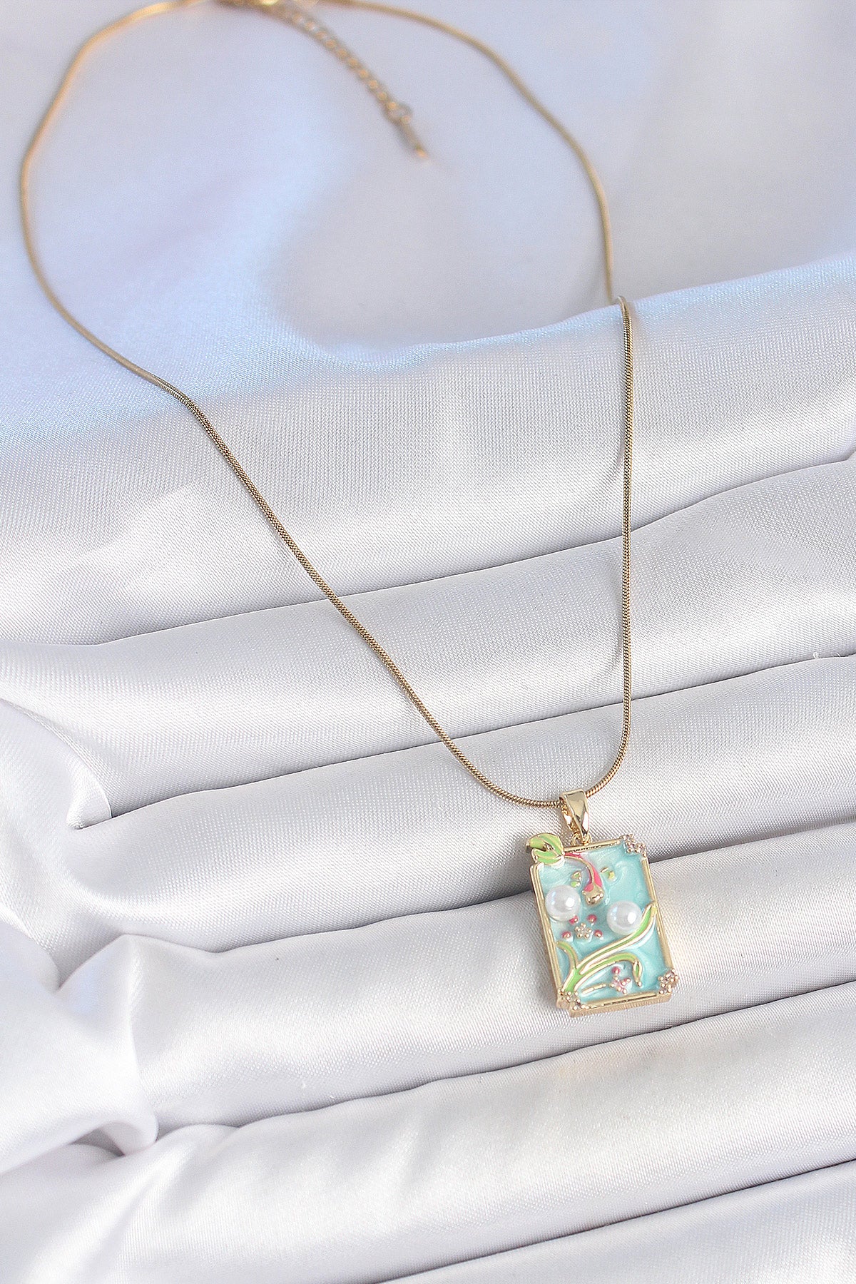 316L Çelik Gold Renk Zincir Mavi Mineli İncili Çiçek İşlemeli Portre Model Kadın Kolye