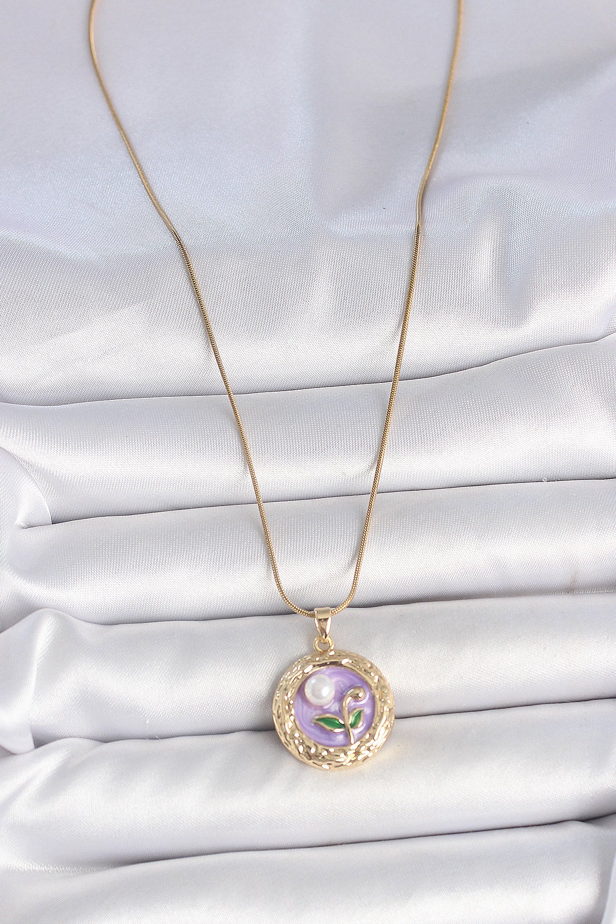 316L Çelik Gold Renk Zincir Mor Çiçek İşlemeli İnci Detay Potre Model Kadın Kolye