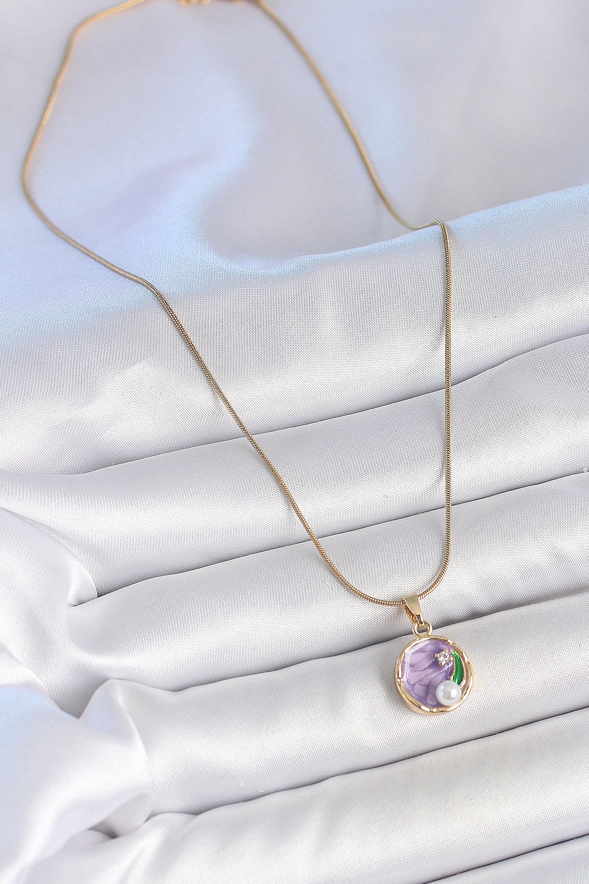 316L Çelik Gold Renk Zincir Mor Çiçek İşlemeli Zirkon Taş İnci Detaylı Minimal Portre Model Kadın Kolye