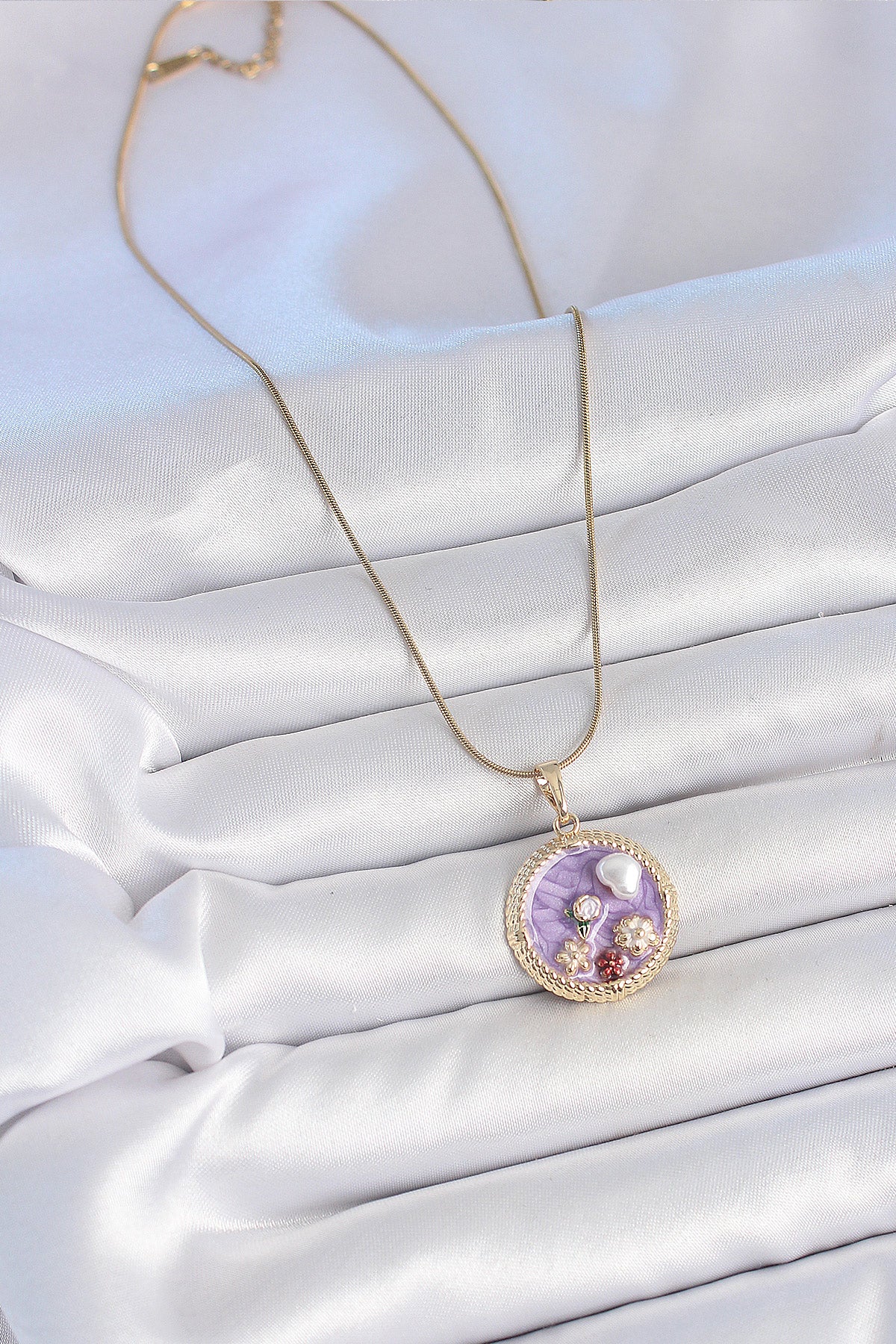 316L Çelik Gold Renk Zincir Mor Mineli İncili Çiçek İşlemeli Madalyon Model Kadın Kolye