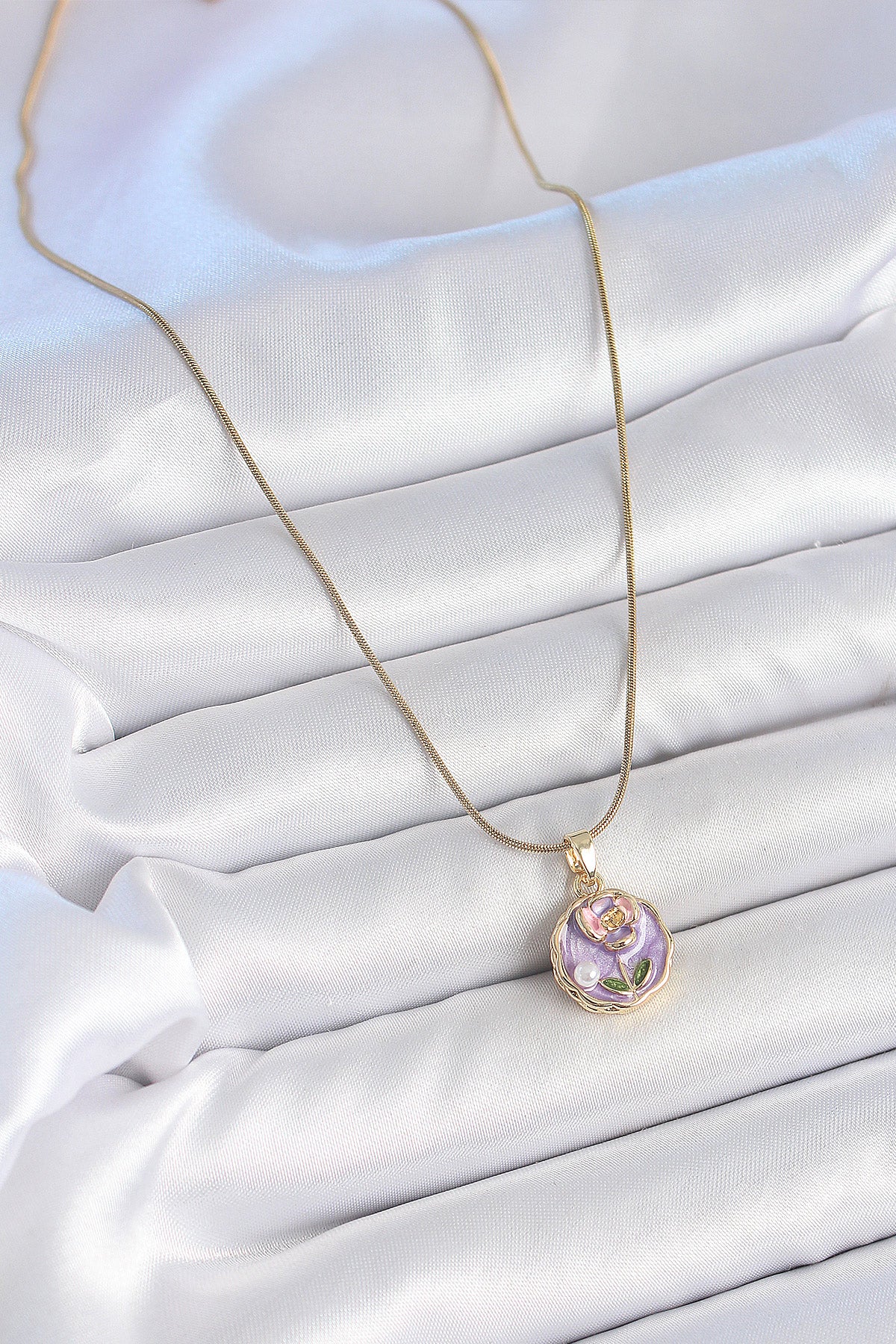 316L Çelik Gold Renk Zincir Mor Minimal Çiçek İşlemeli İnci Detay Portre Model Kadın Kolye