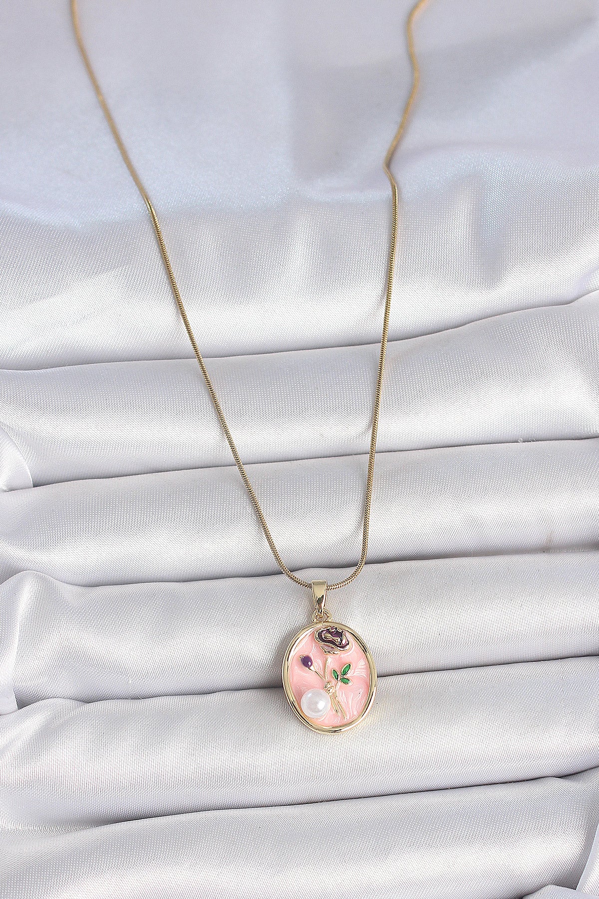 316L Çelik Gold Renk Zincir Pembe Çiçek İşlemeli İnci Detay Portre Model Kadın Kolye
