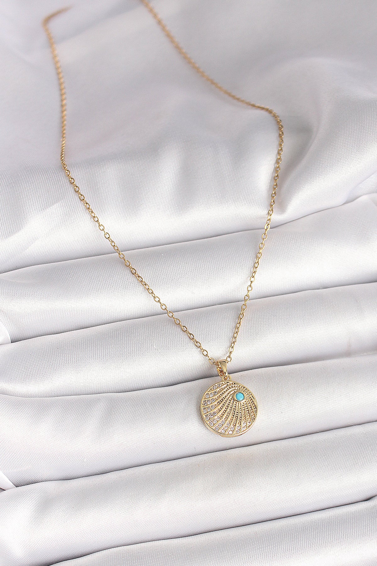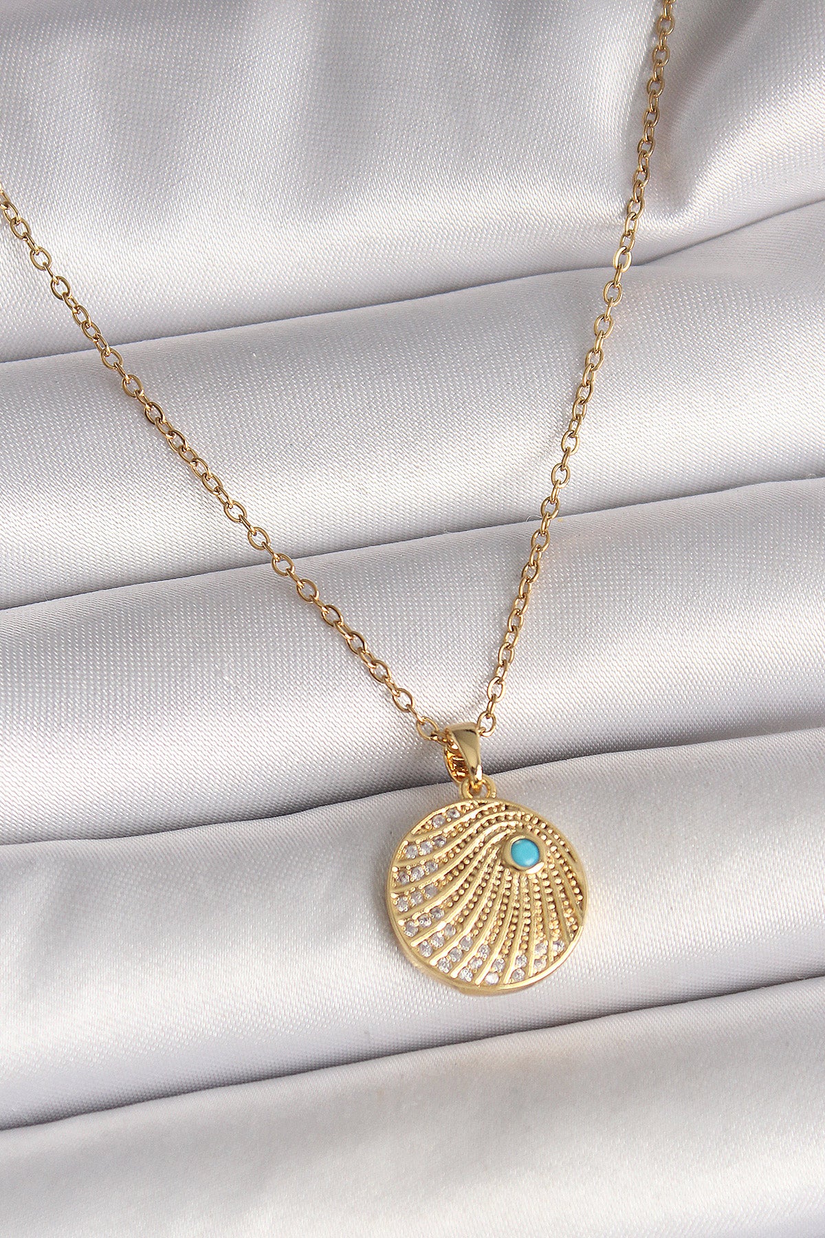 316L Çelik Gold Renk Zincir Zirkon Taş İşlemeli Mavi Taş Detaylı Madalyon Model Kadın Kolye