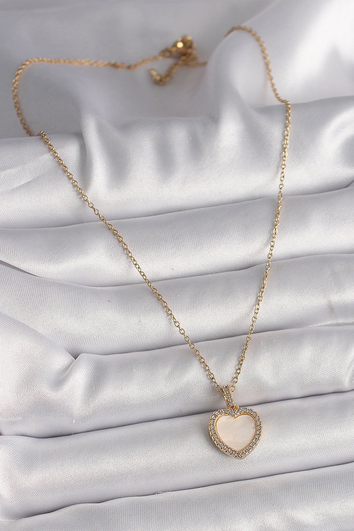 316L Çelik Gold Renk Zincir Zirkon Taşlı Beyaz Mineli Kalp Model Kadın Kolye