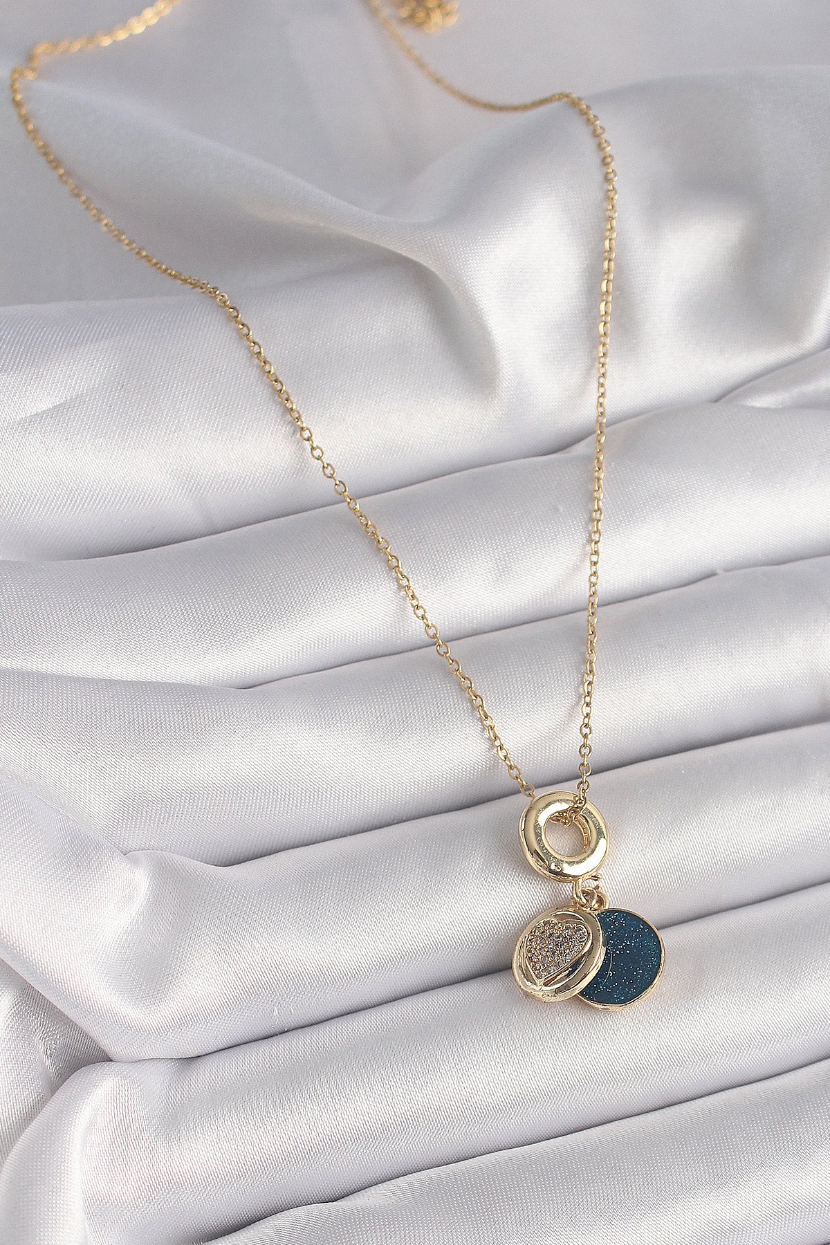 316L Çelik Gold Renk Zincir Zirkon Taşlı Kalp Model Mavi Simli Kadın Kolye