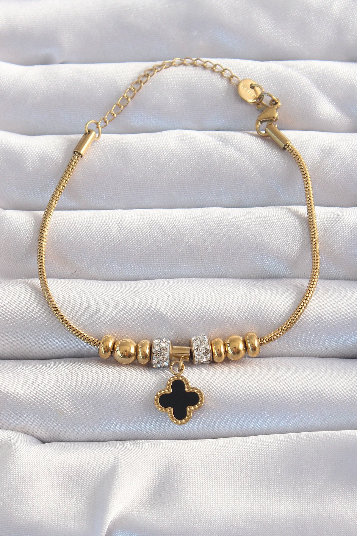 316L Çelik Gold Renk Zirkon Taş Aksesuarlı Siyah Mineli Yonca Bileklik