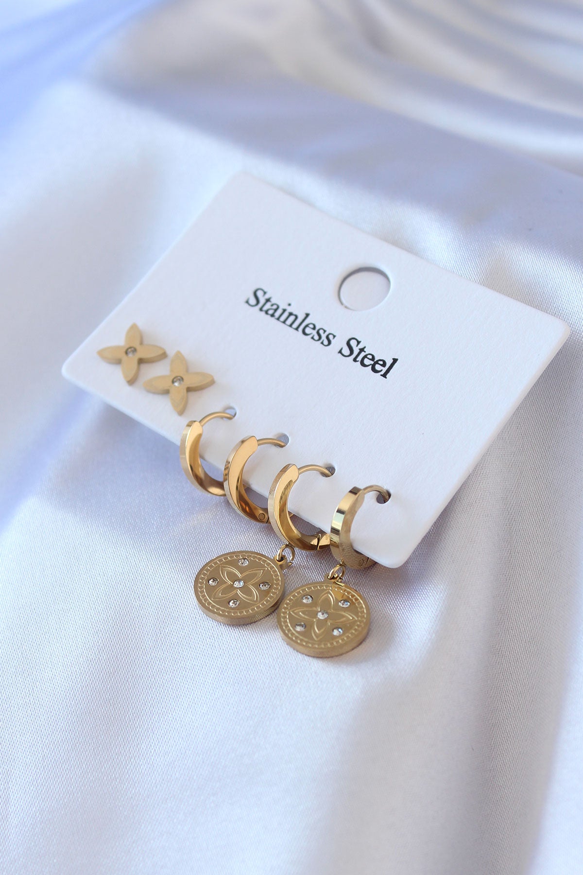 316L Çelik Gold Renk Zirkon Taş Detay Çiçek İşleme Kadın Küpe Seti