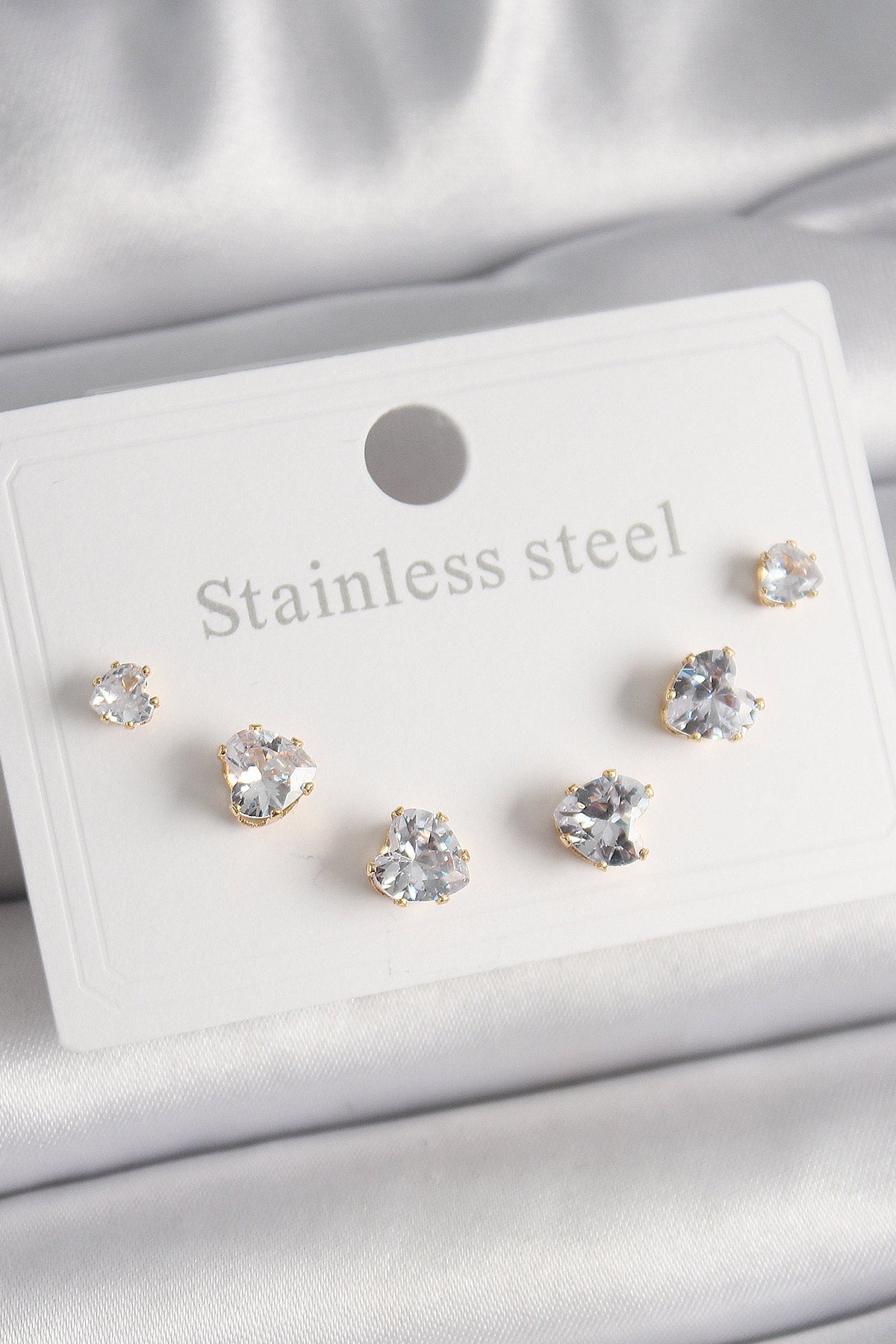316L Çelik Gold Renk Zirkon Taşlı Kalp Model Kadın Küpe Seti