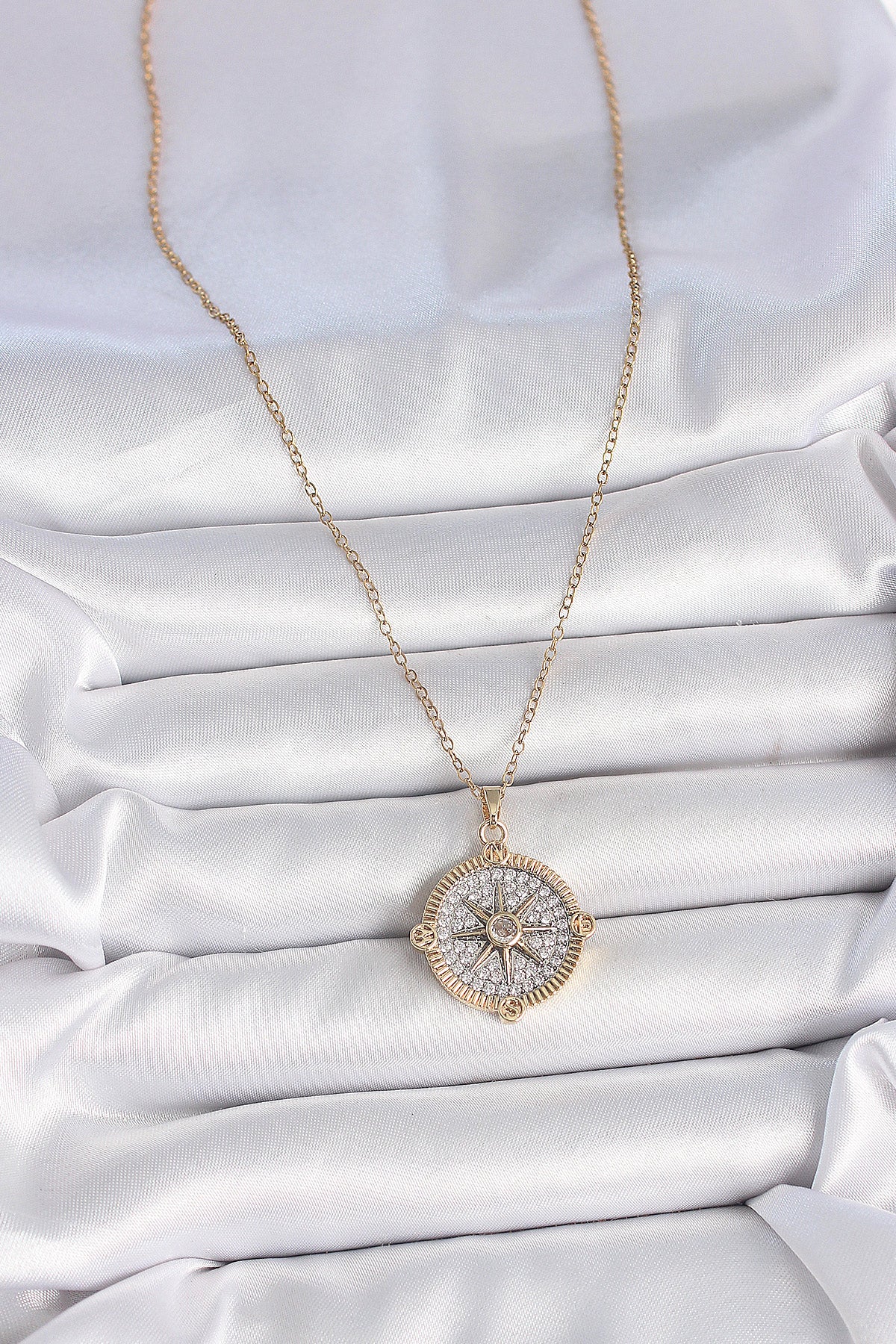 316L Çelik Gold Renk Zirkon Taşlı Pusula Model Kadın Kolye