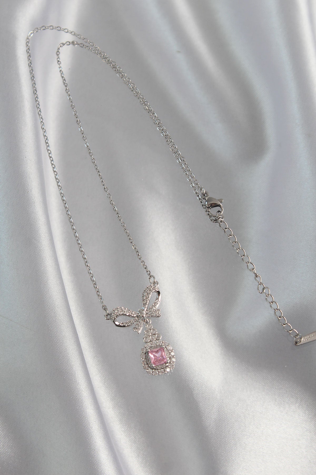 316L Çelik Gümüş Renk Fiyonk Detay Pembe Zirkon Taşlı Tektaş Kolye