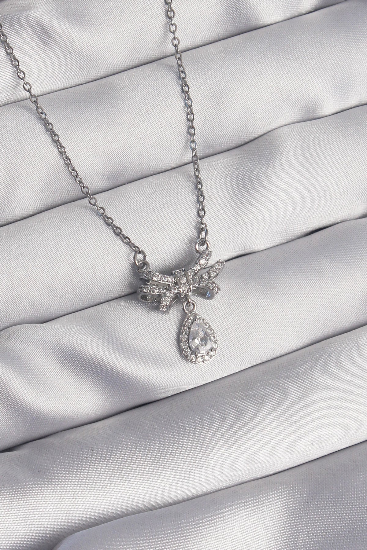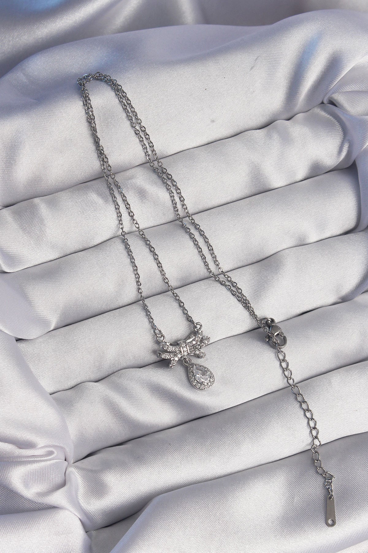 316L Çelik Gümüş Renk Fiyonk Detaylı Zirkon Taşlı Damla Model Kolye