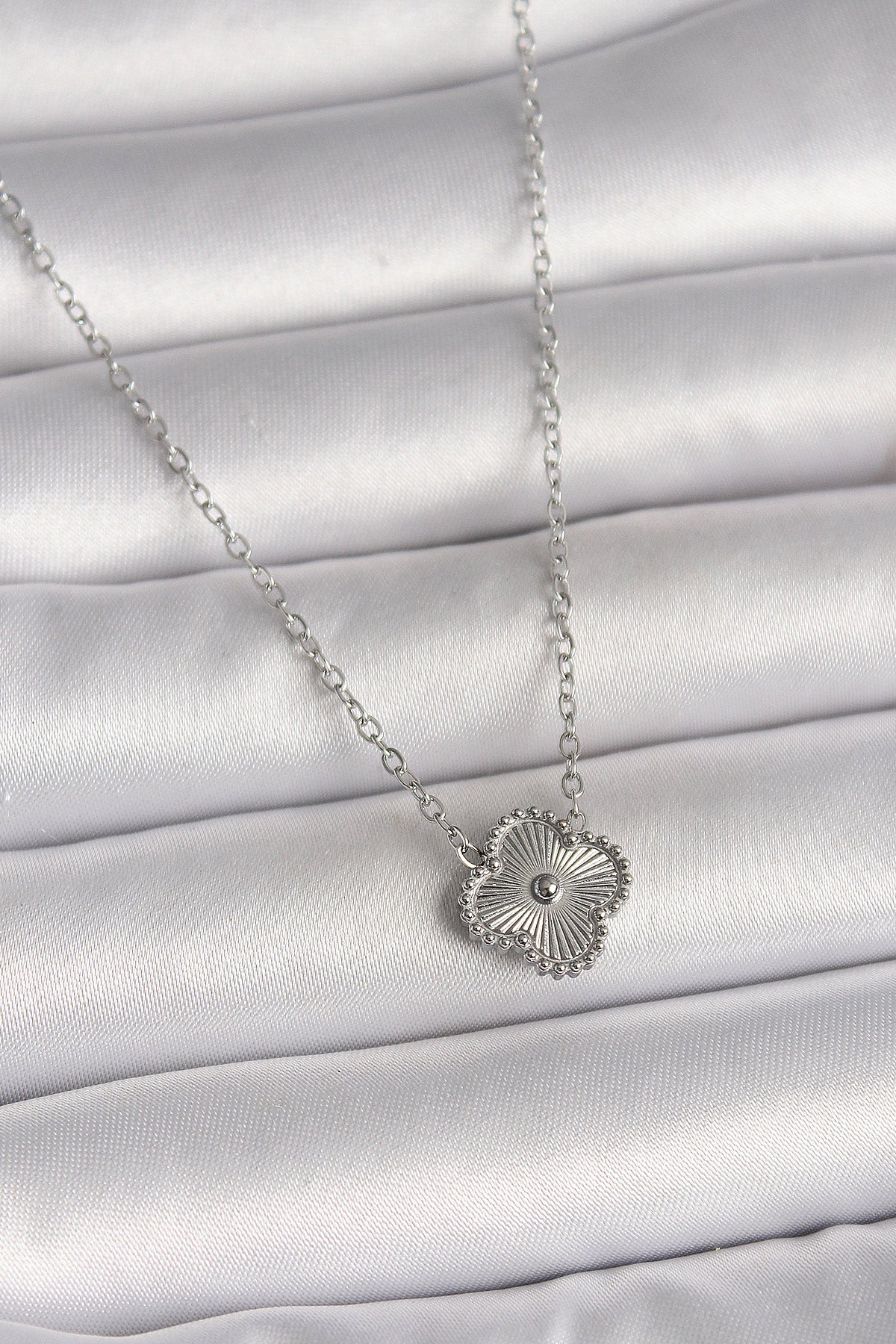 316L Çelik Gümüş Renk İşleme Detaylı Yonca Model Kadın Kolye