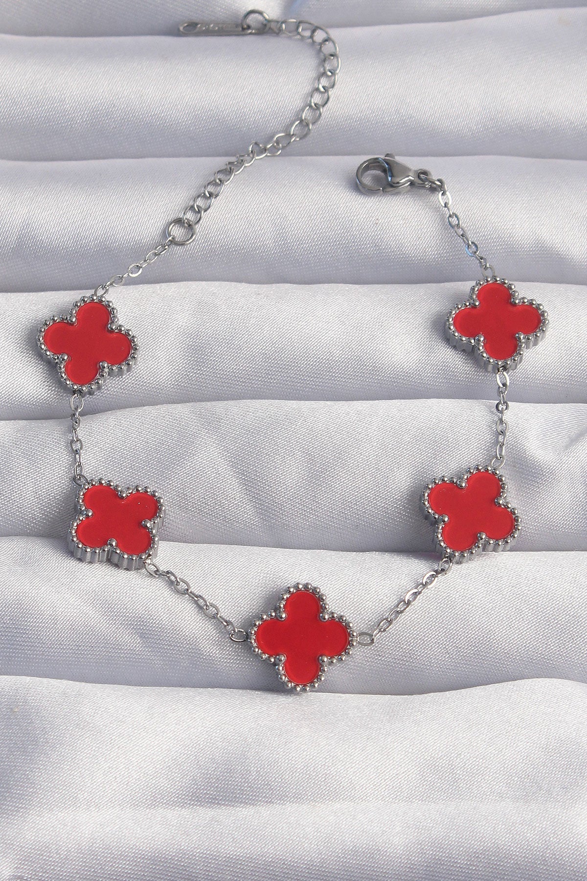 316L Çelik Gümüş Renk Kırmızı Mineli Yonca Bileklik