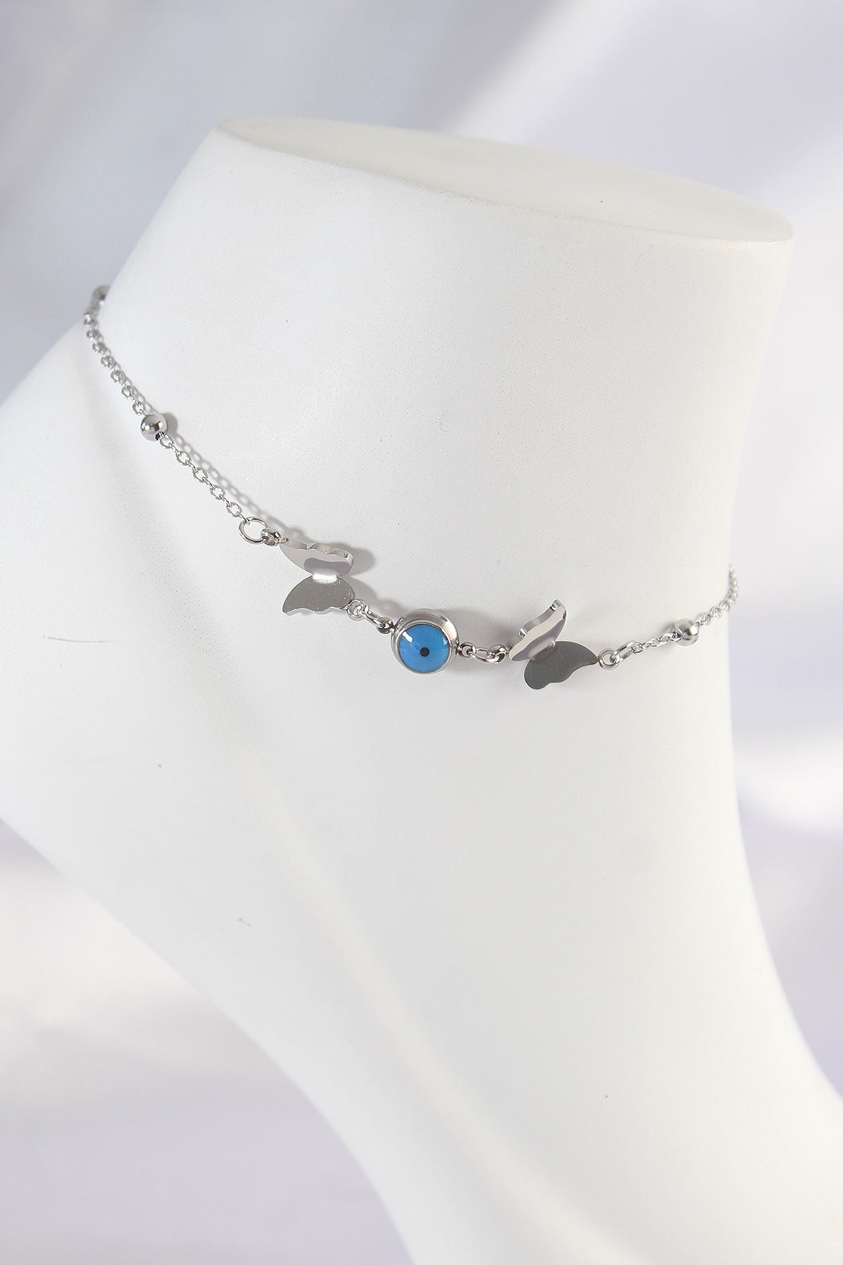 316L Çelik Gümüş Renk Nazar Boncuk Detay Kelebek Halhal