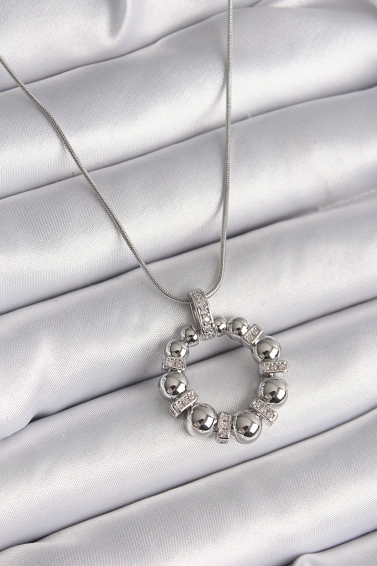 316L Çelik Gümüş Renk Zincir Zirkon Taş Detaylı Bombeli Halka Model Kadın Kolye