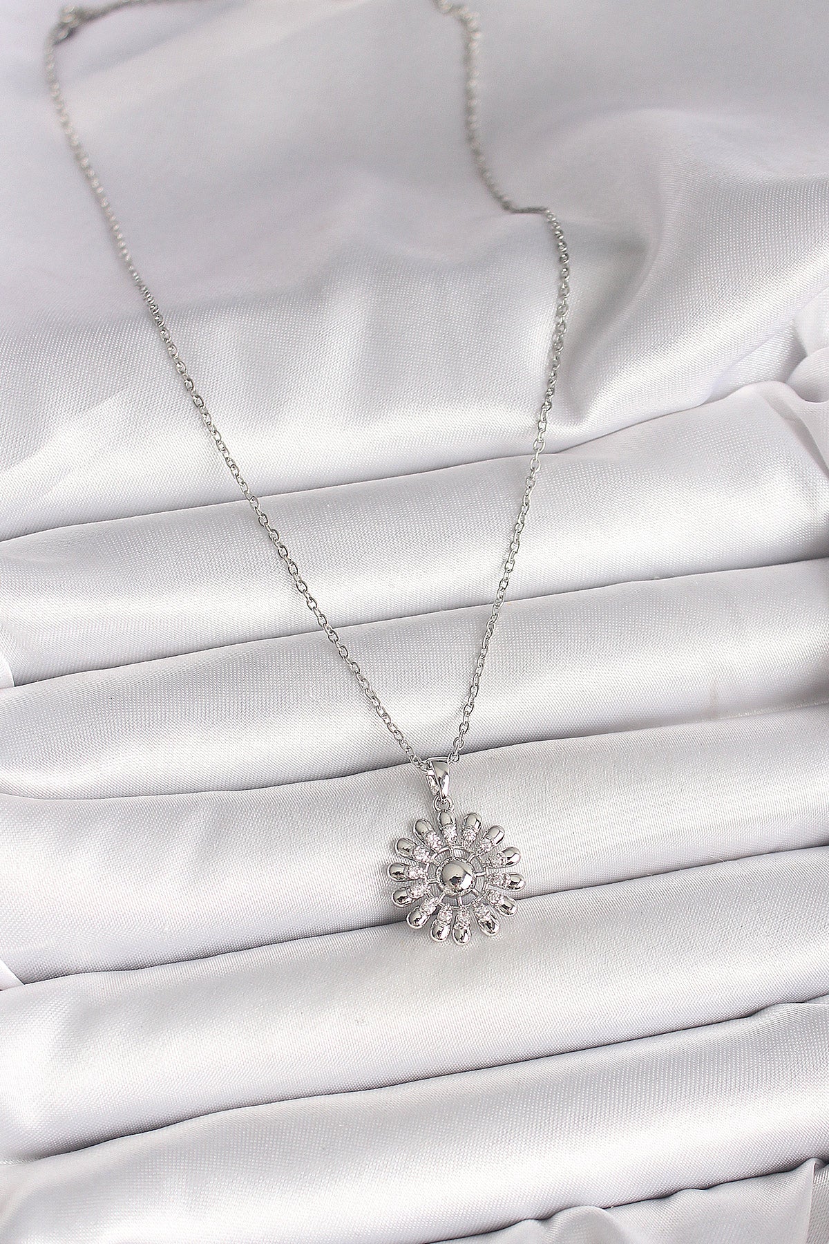316L Çelik Gümüş Renk Zincir Zirkon Taşlı Güneş Model Kadın Kolye