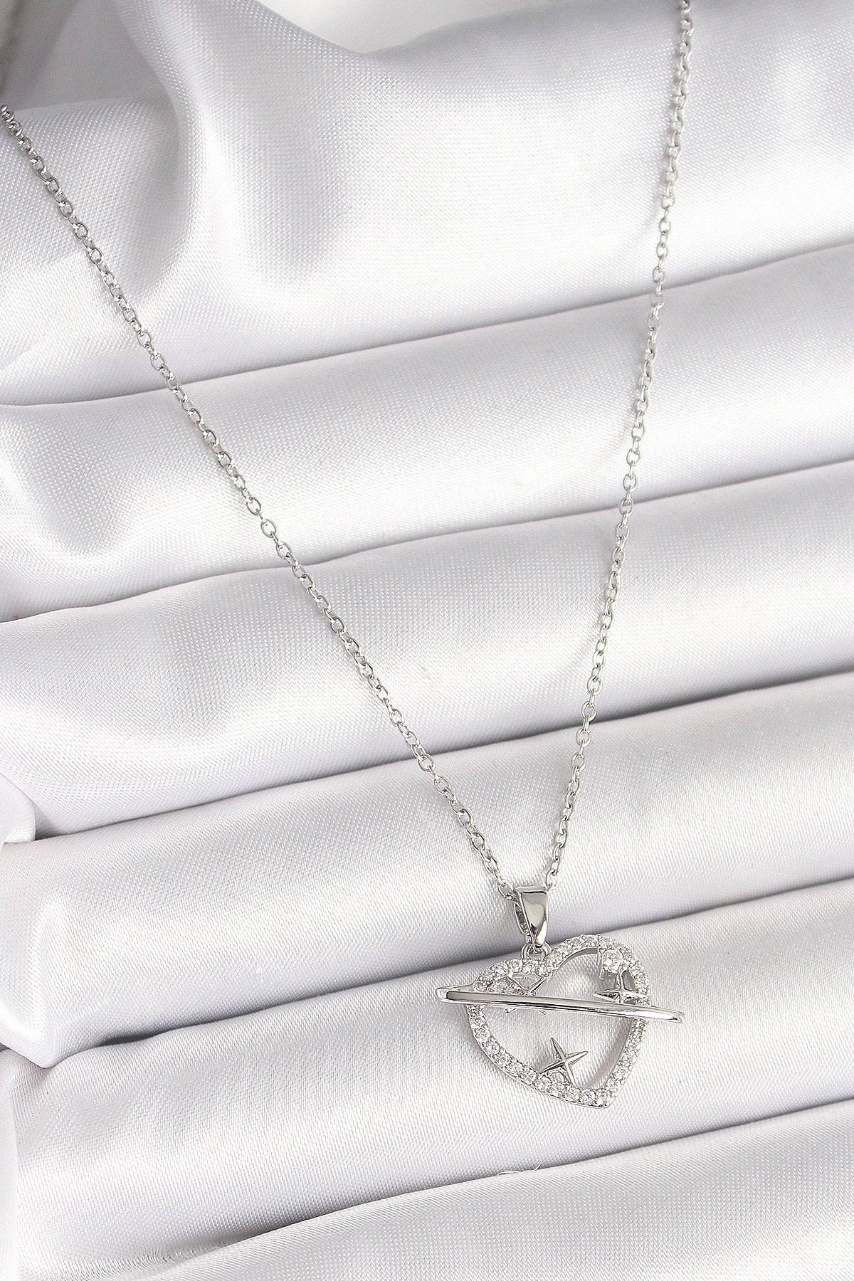316L Çelik Gümüş Renk Zincir Zirkon Taşlı Kalp Model Yıldız Detay Kadın Kolye