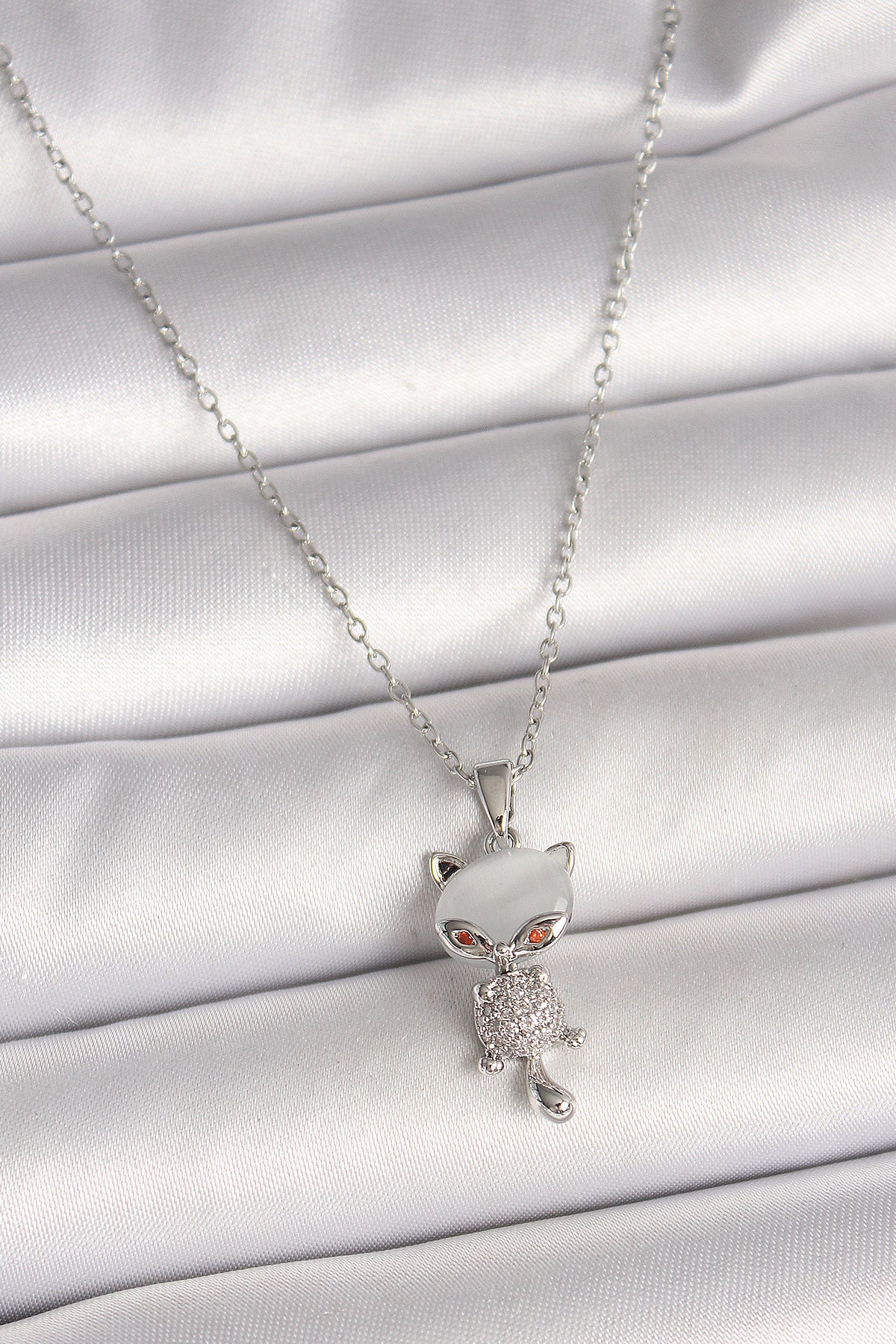 316L Çelik Gümüş Renk Zincir Zirkon Taşlı Kedi Model Kadın Kolye