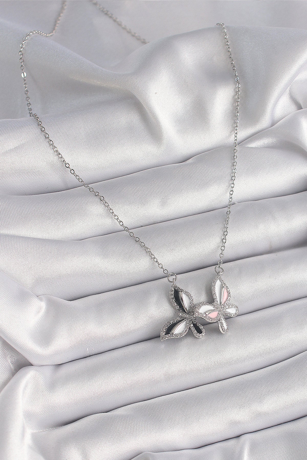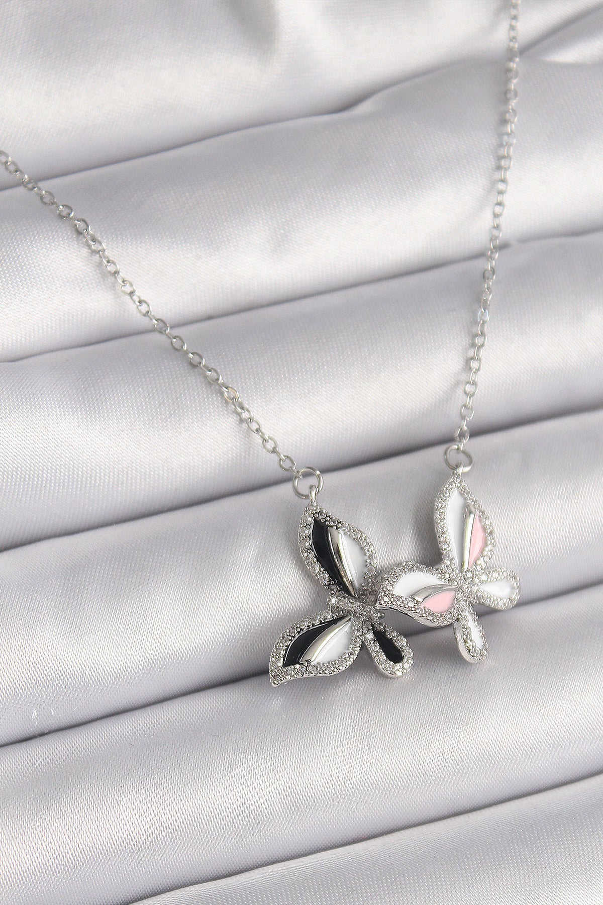 316L Çelik Gümüş Renk Zincir Zirkon Taşlı Renkli Kelebek Model Kadın Kolye