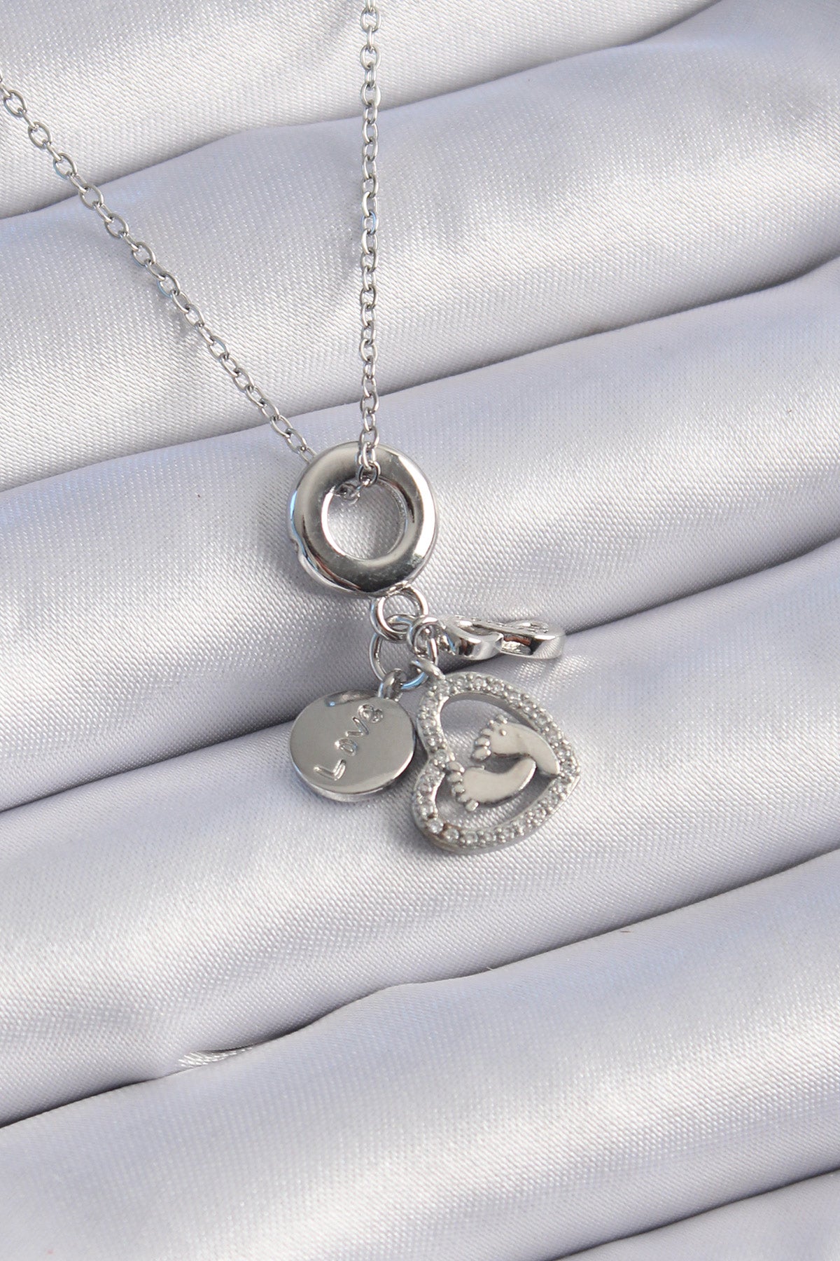 316L Çelik Gümüş Renk Zirkon Taş Detay Kalp Model Charm Kadın Kolye