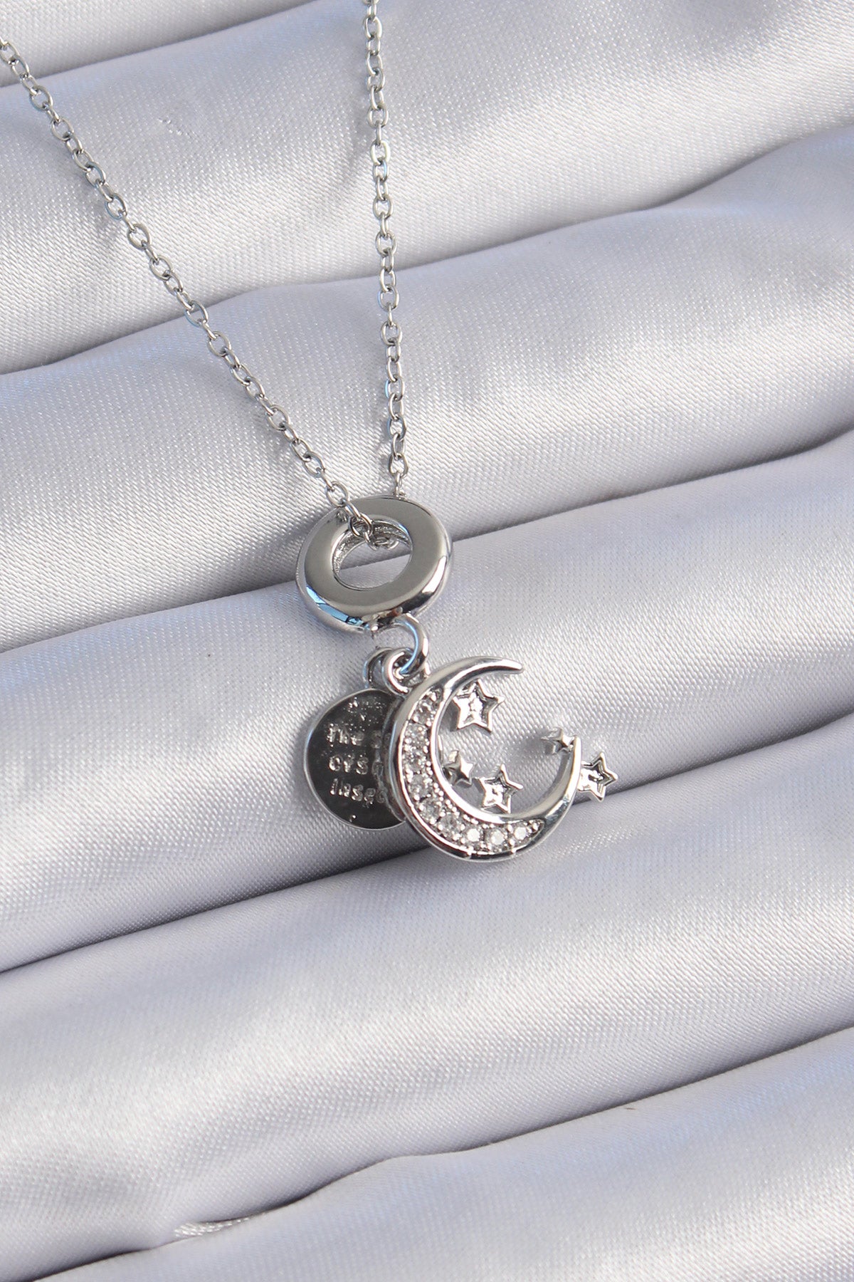 316L Çelik Gümüş Renk Zirkon Taşlı Ay Yıldız Figür Charm Model Kadın Kolye