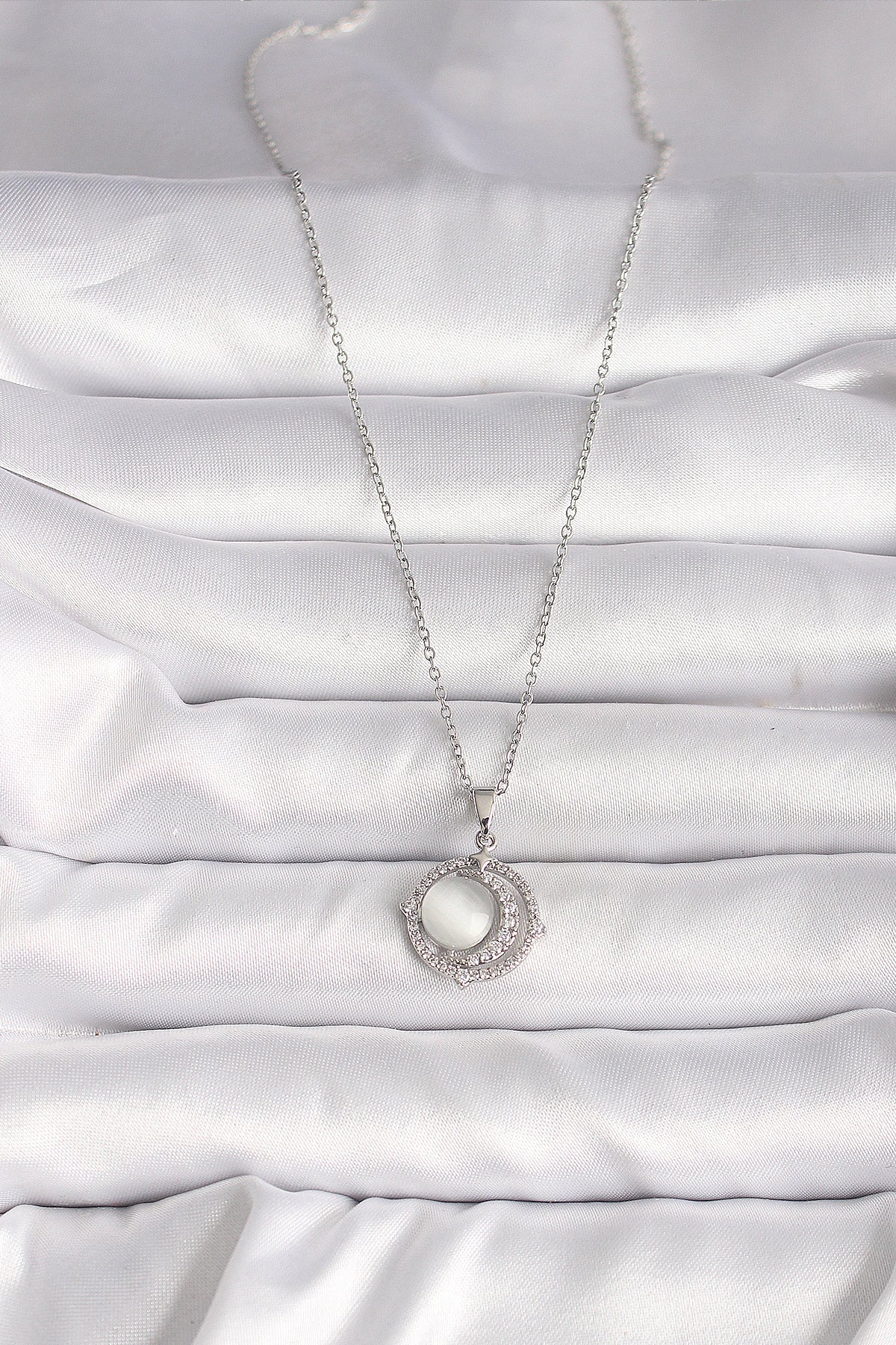 316L Çelik Gümüş Renk Zirkon Taşlı Beyaz Sedefli Hilal Model Kadın Kolye