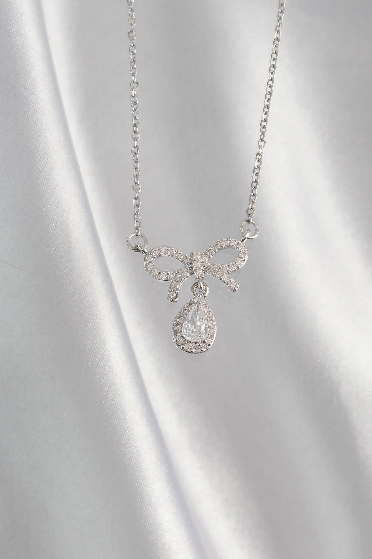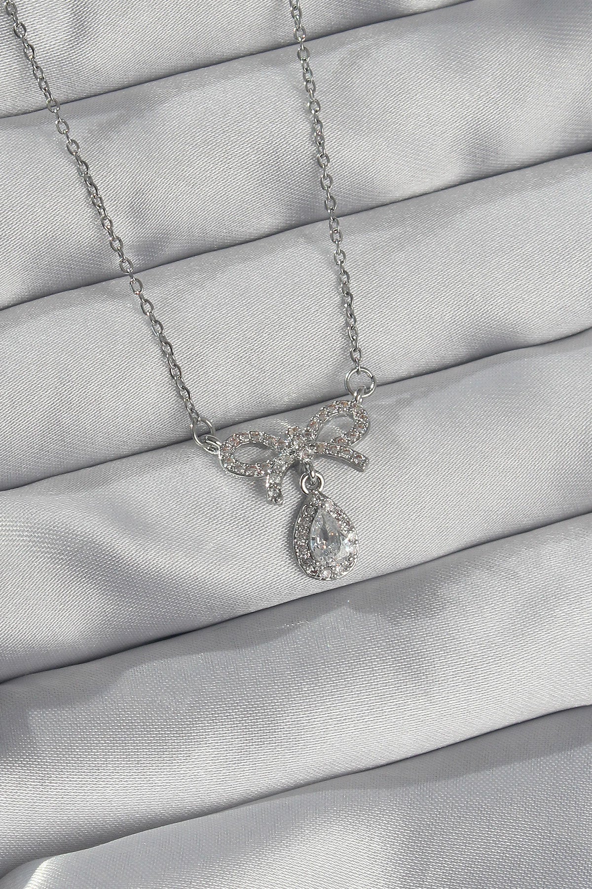 316L Çelik Gümüş Renk Zirkon Taşlı Fiyonk Detay Damla Kolye
