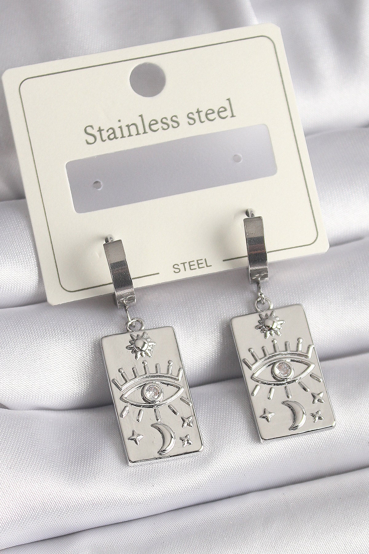 316L Çelik Gümüş Renk Zirkon Taşlı Göz İşleme Detaylı Plaka Model Kadın Küpe