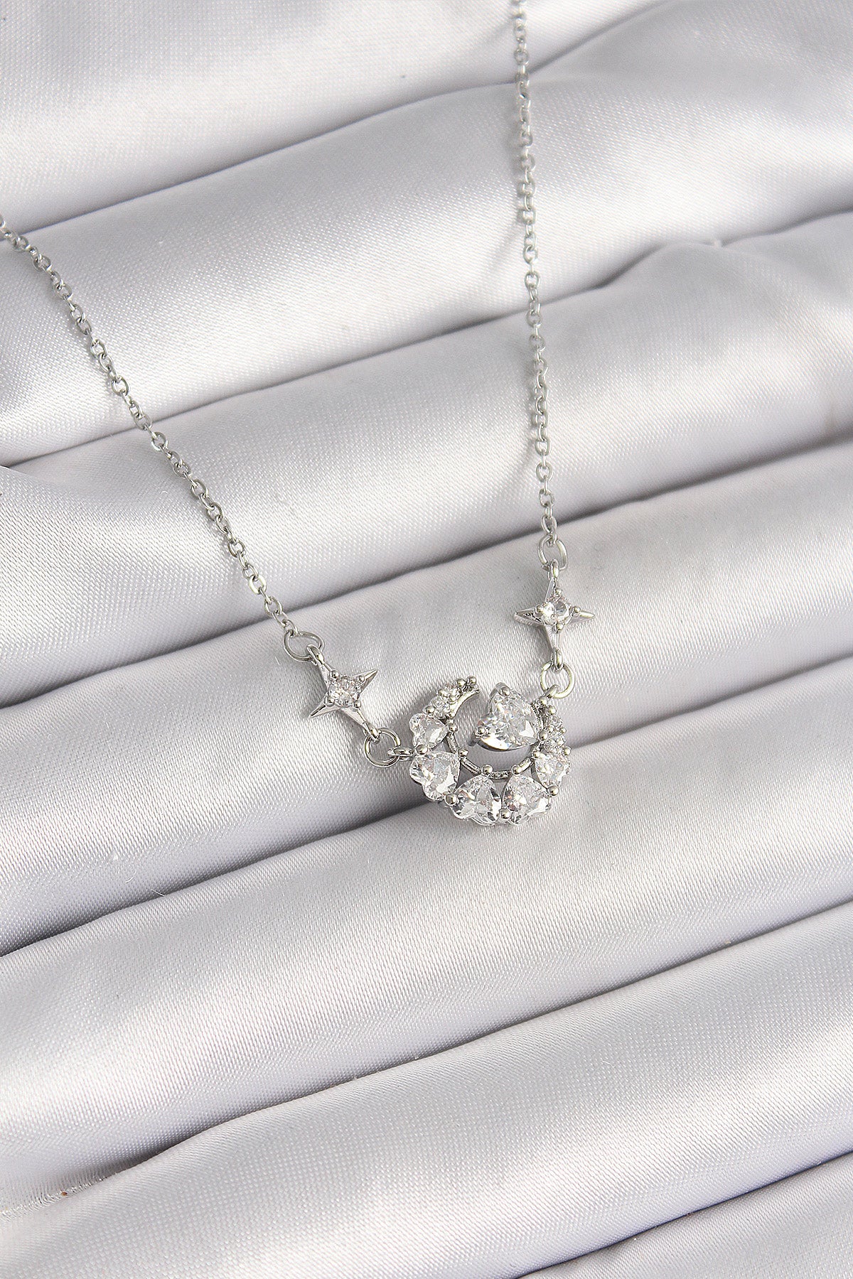 316L Çelik Gümüş Renk Zirkon Taşlı Hilal Kalp Model Kadın Kolye