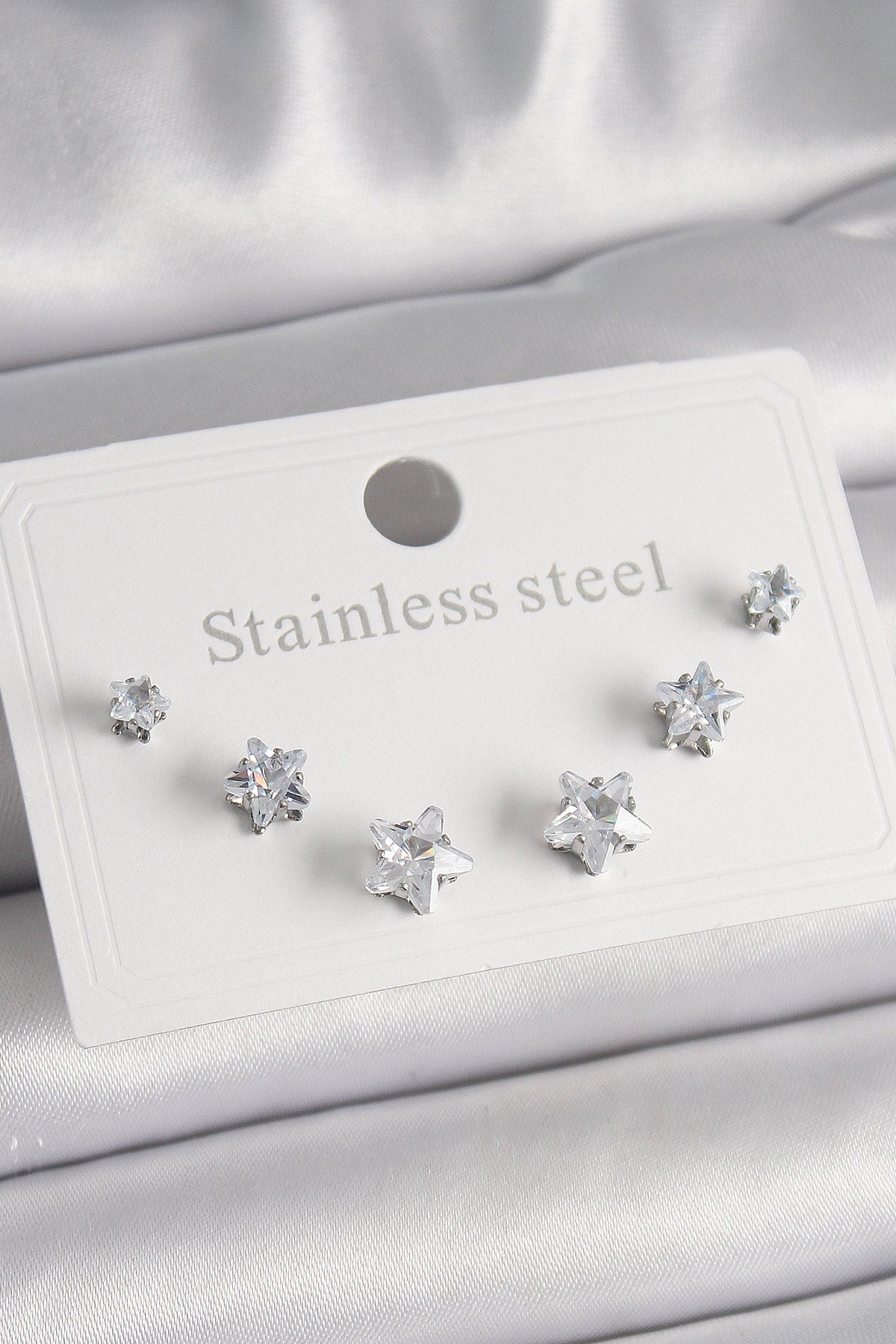 316L Çelik Gümüş Renk Zirkon Taşlı Yıldız Model Kadın Küpe Seti