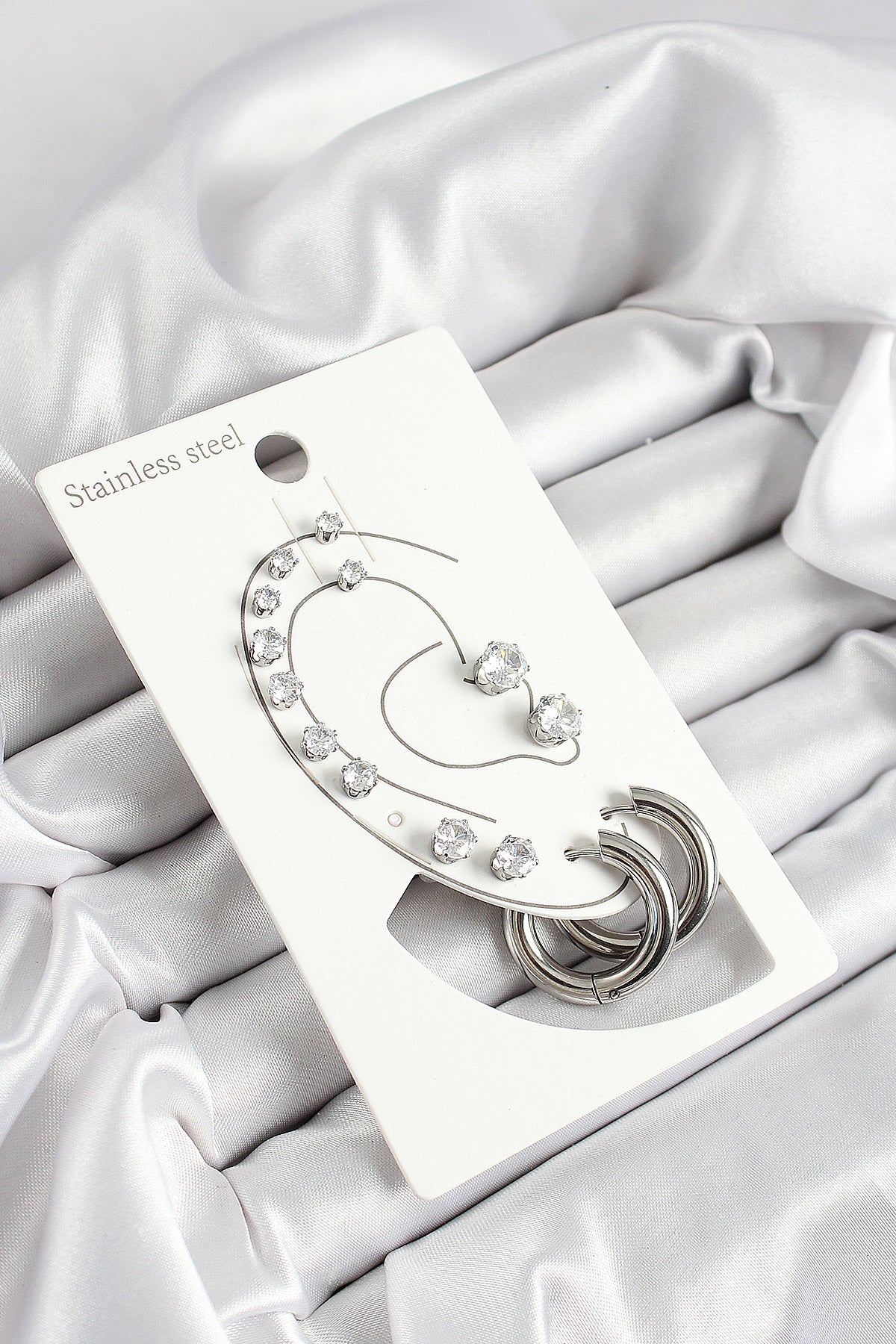 316L Çelik Halka Figürlü Ve Zirkon Taşlı Gümüş Renk 7'li Çift Kadın Küpe Set