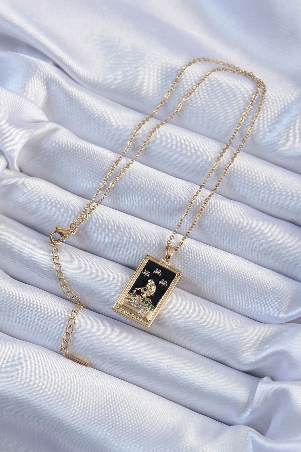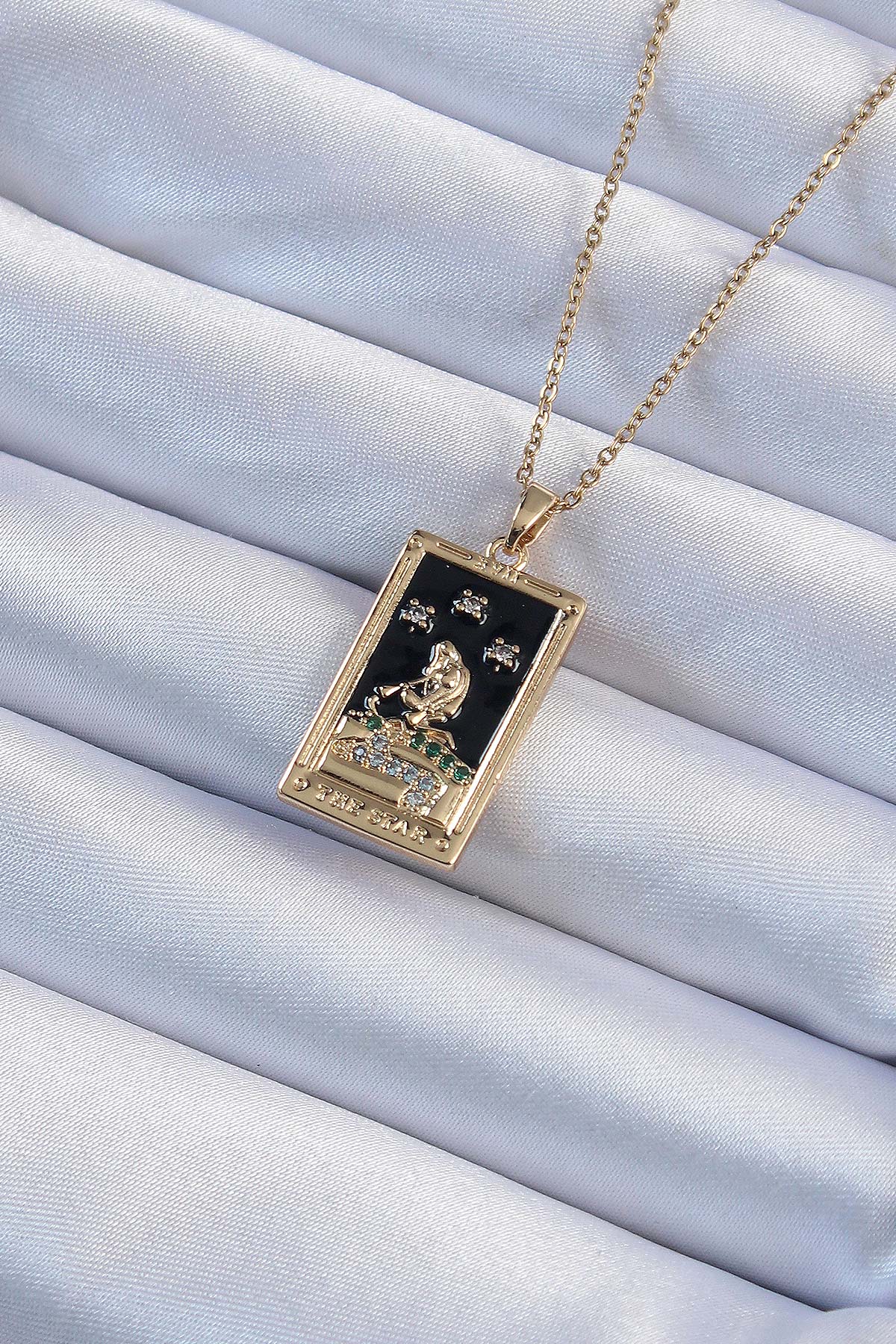 316L Çelik Zincir Altın Renk Zirkon Taşlı Siyah Mineli Kız Figürlü Tarot Kolye