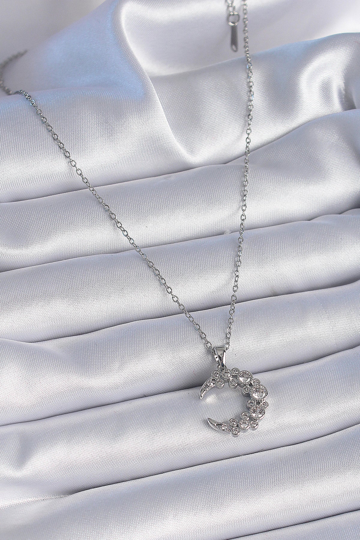 316L Çelik Zincir Gümüş Renk Zirkon Taşlı Hilal Model Kadın Kolye