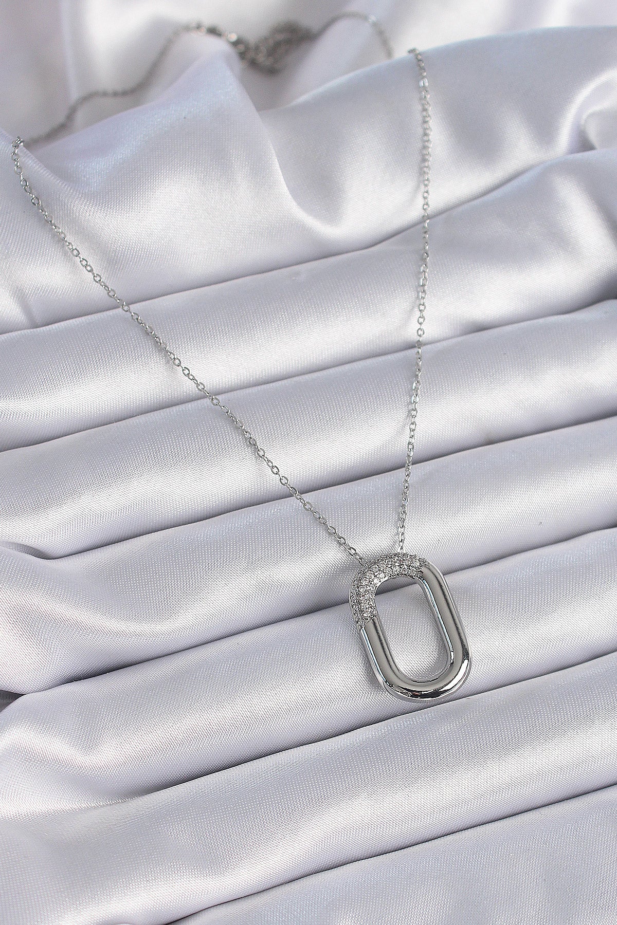 316L Çelik Zincir Gümüş Renk Zirkon Taşlı Oval Halka Model Kadın Kolye