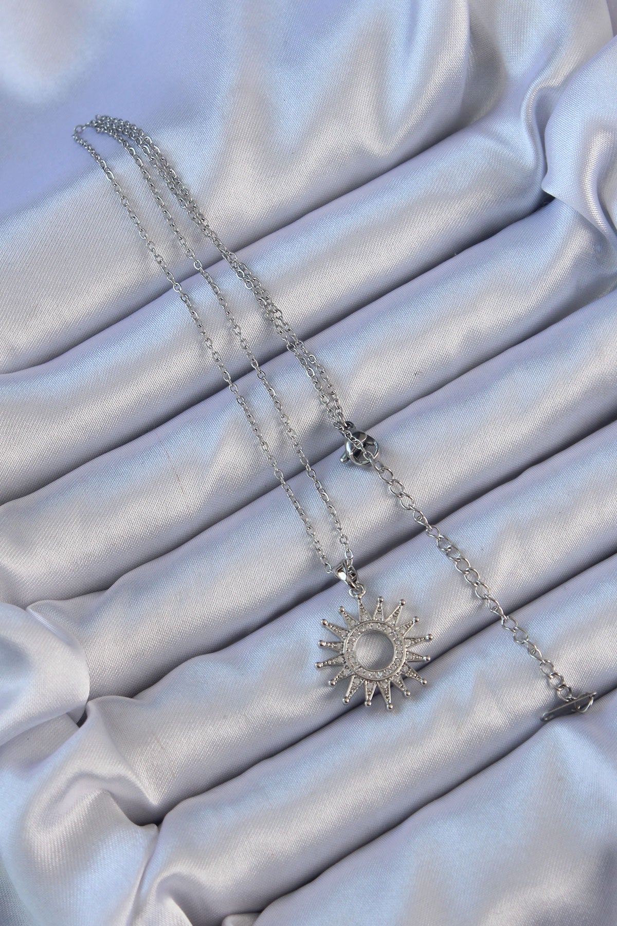 316L Çelik Zincir Gümüş Renk Zirkon Taşlı Parlayan Güneş Kolye