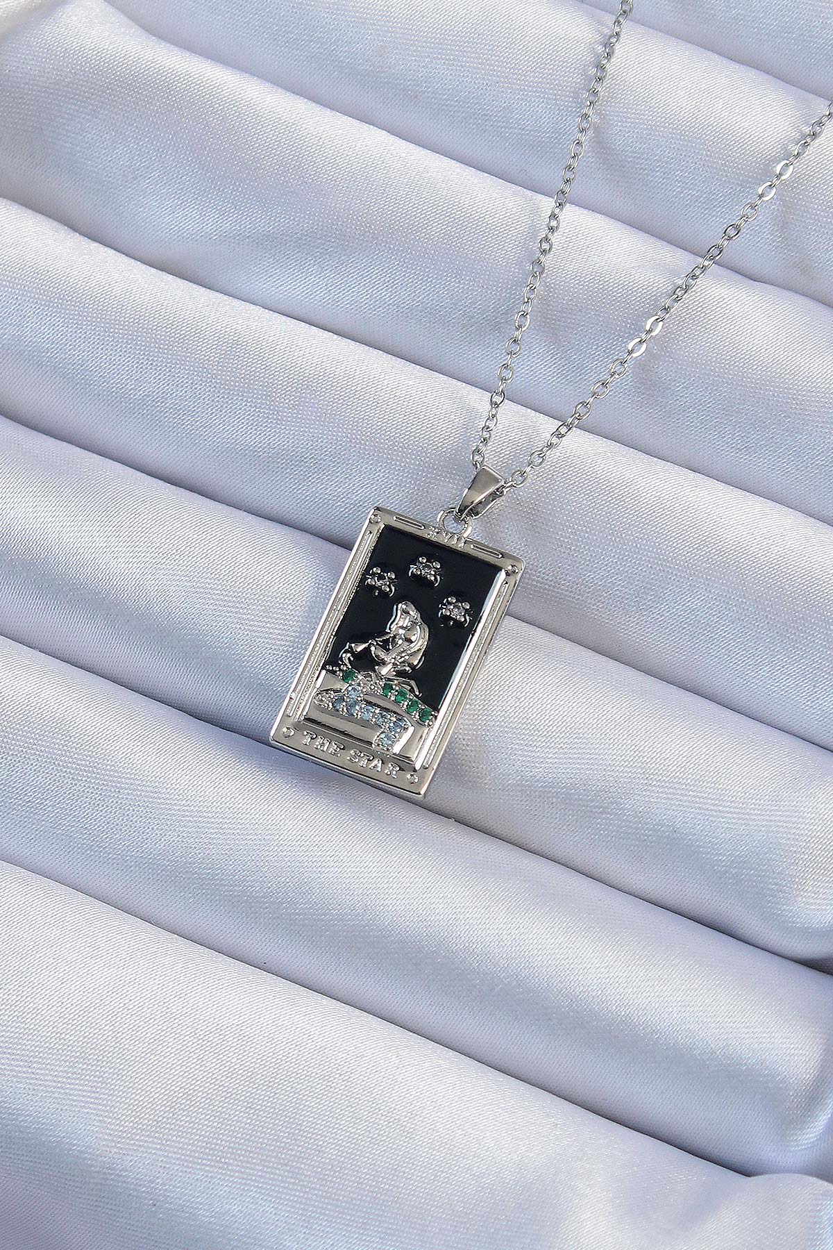 316L Çelik Zincir Gümüş Renk Zirkon Taşlı Siyah Mineli Kız Figürlü Tarot Kolye