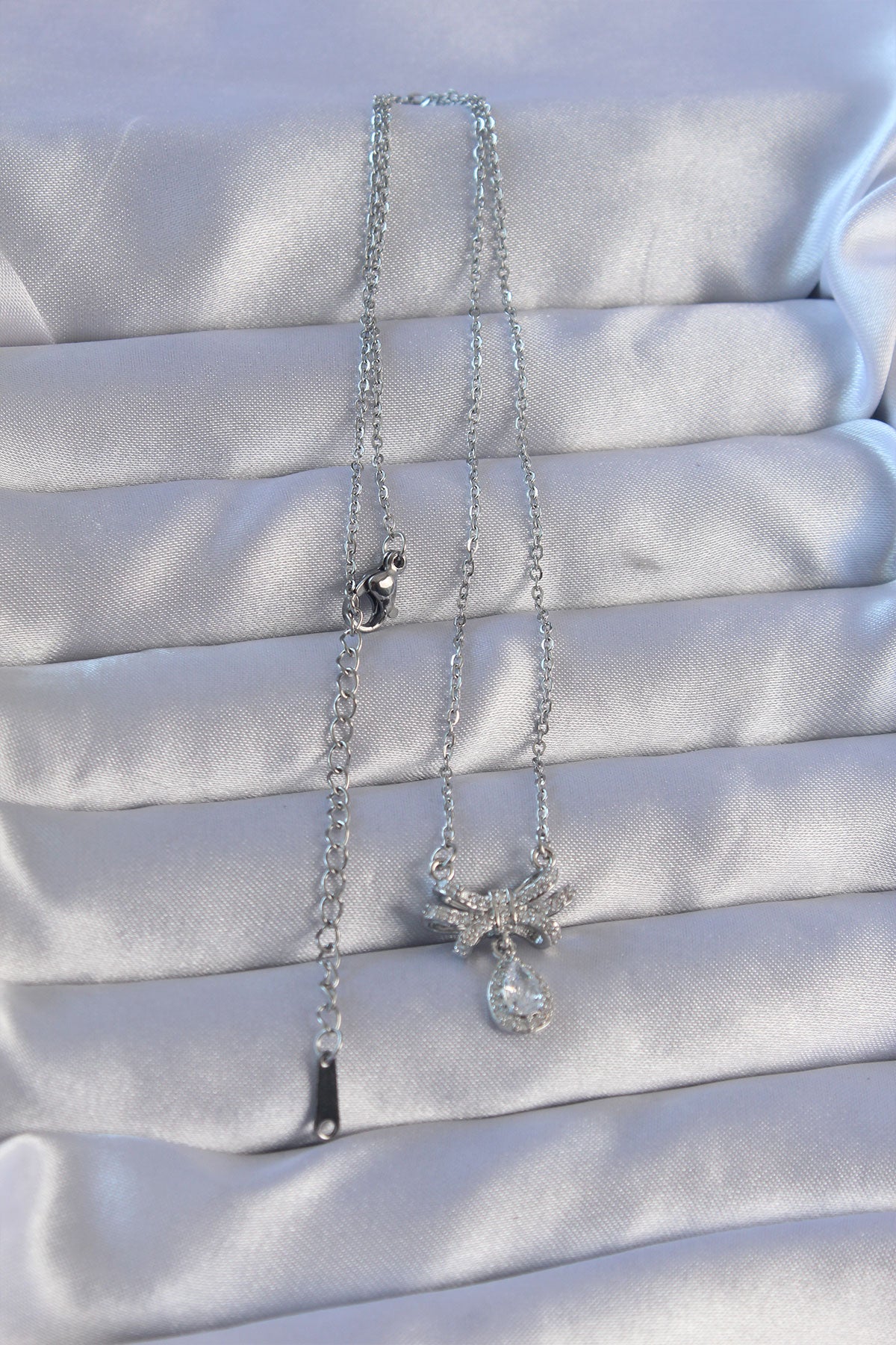 316L Çelik Zincirli Gümüş Renk Zirkon Taşlı Damla Detay Fiyonk Model Kolye