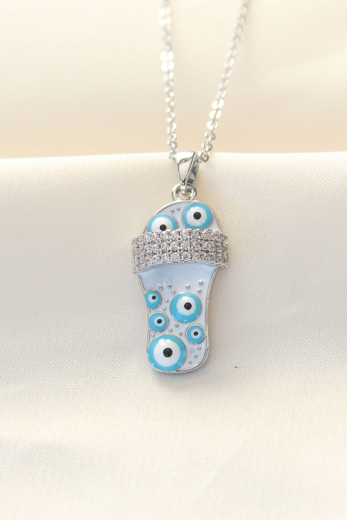 316L Zinciri Çelik Zirkon Taşlı Gümüş Renk Nazar Boncuklu Terlik Kolye