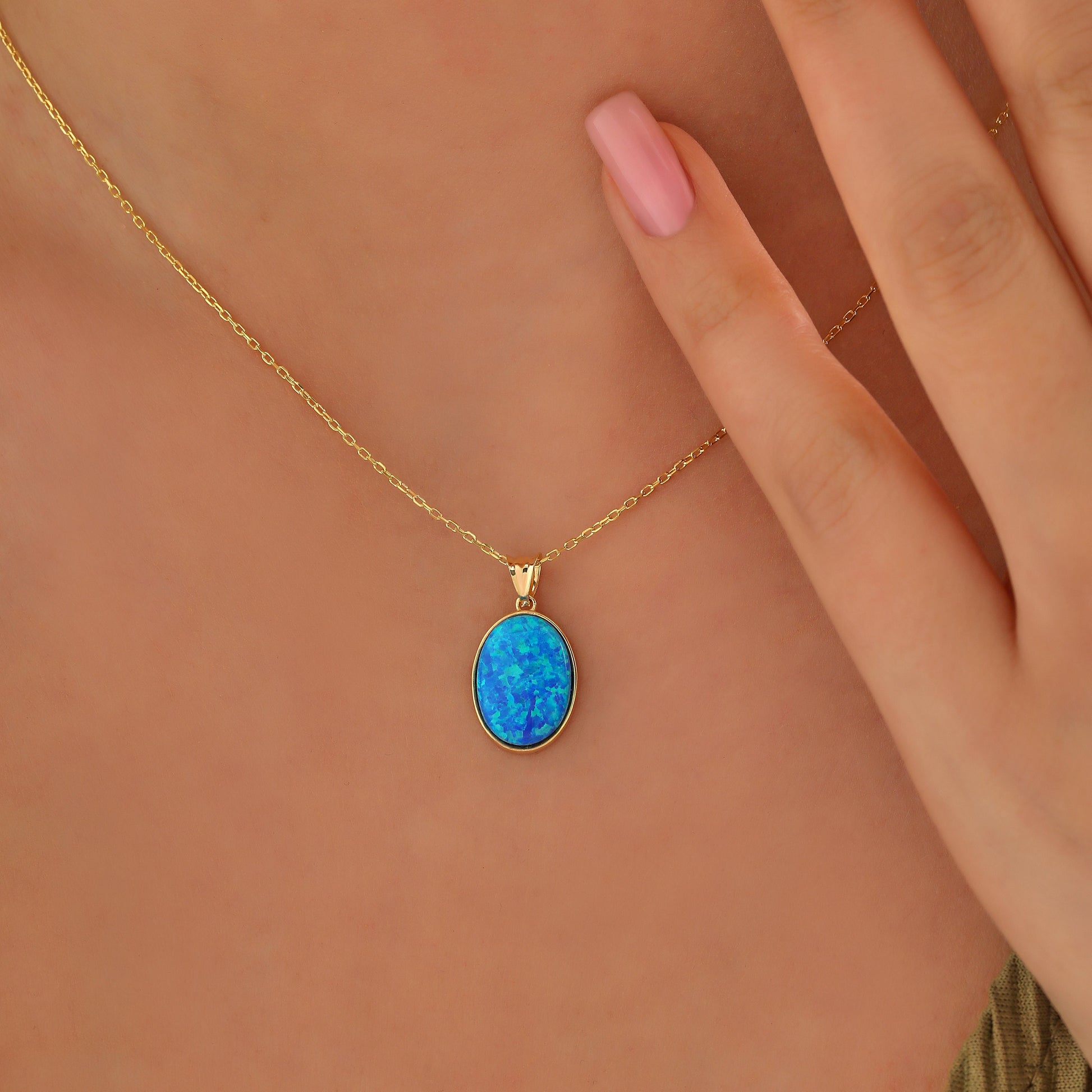 Blue Opal Necklace: 14K Gold Sterling Silver Oval Pendant
