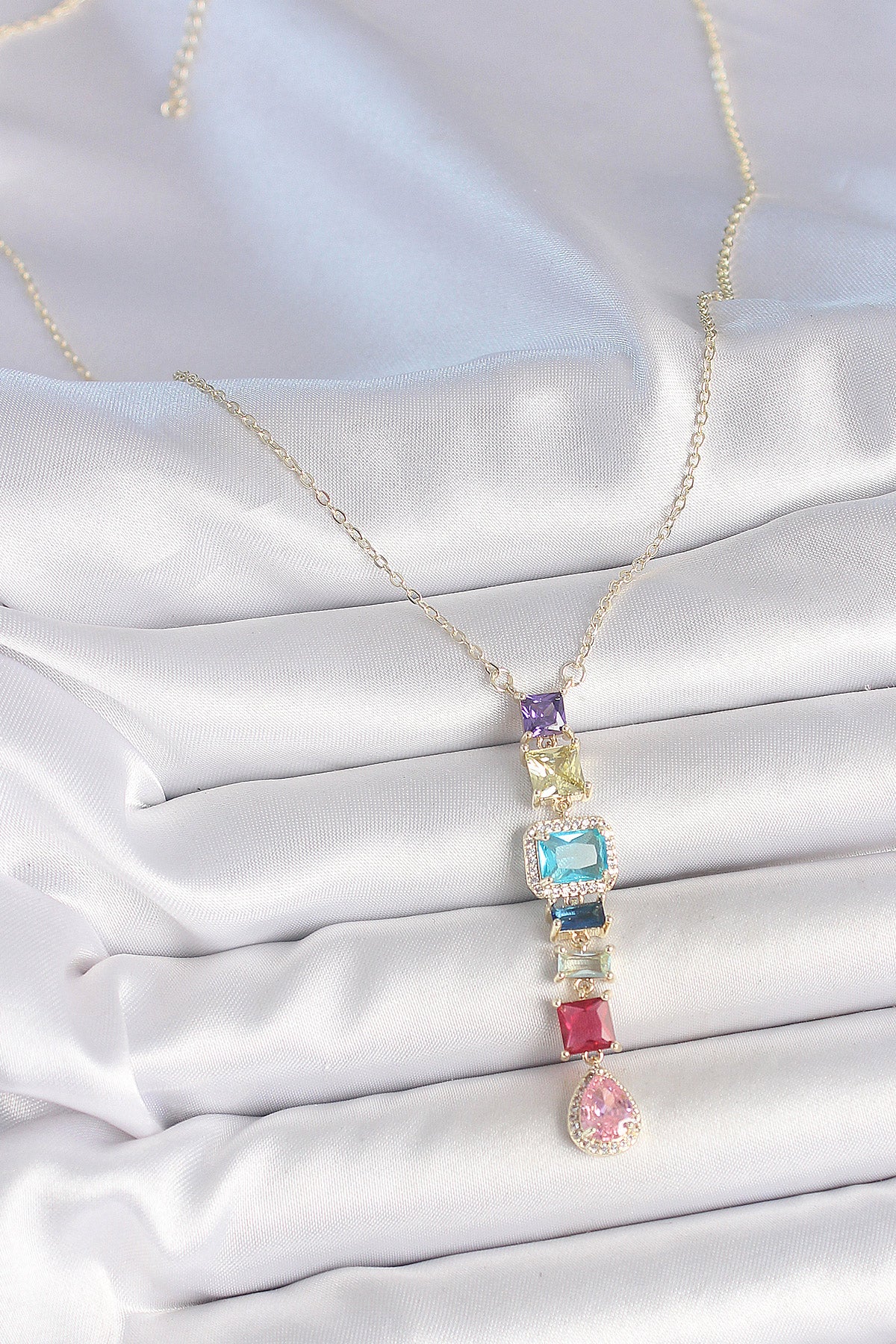 Gold Karışık Renk Zirkon Taşlı Y Pirinç Kolye